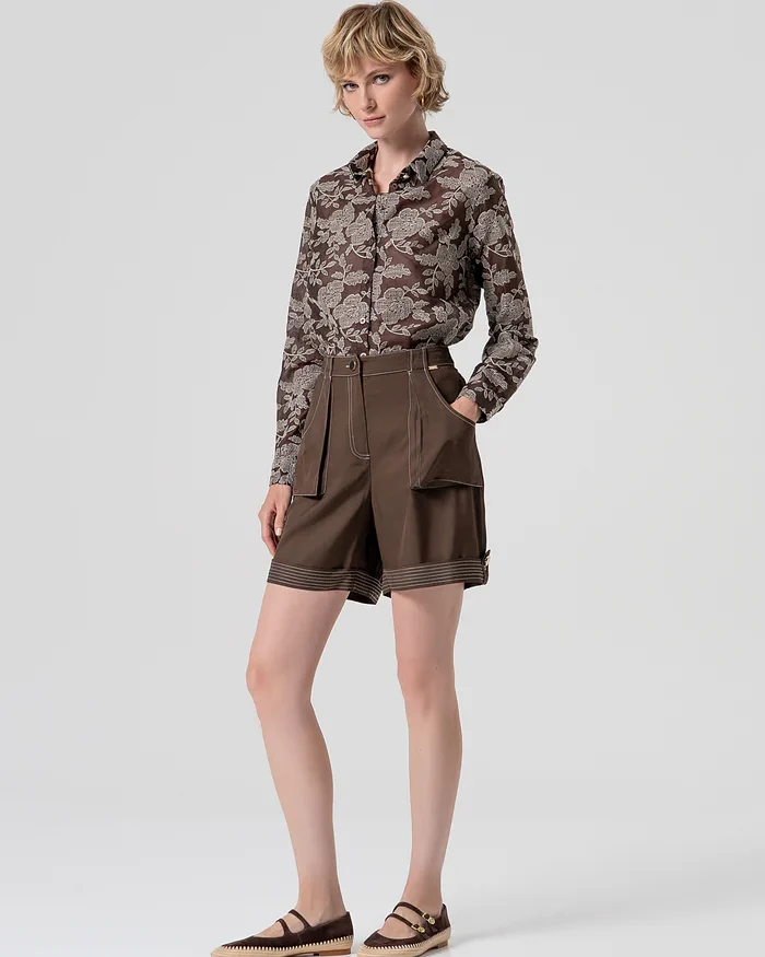 Pantalón corto de corte regular confeccionado en viscosa. Cintura regular, bolsillos de fuelle en la parte delantera y dobladillo en el bajo de la pierna.