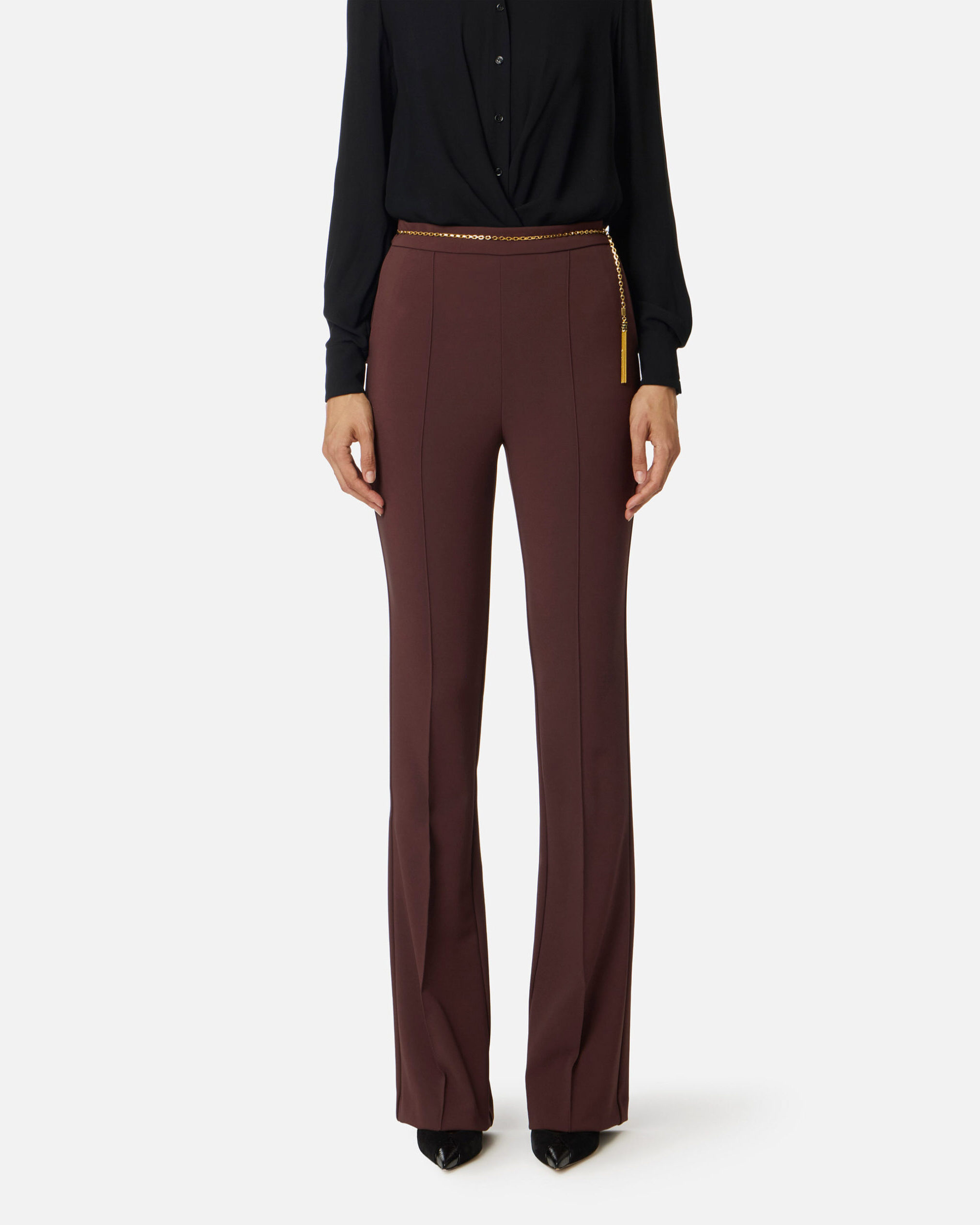 Pantalón de crepé ligero de talla adherente con pernera levemente evasé en el tobillo. Se caracteriza por el cinturón que adorna la cintura, realizado de cadena con logotipo y borla colgante. En la parte trasera presenta solapas de parche con botones esmaltados y diseño de inspiración snake.