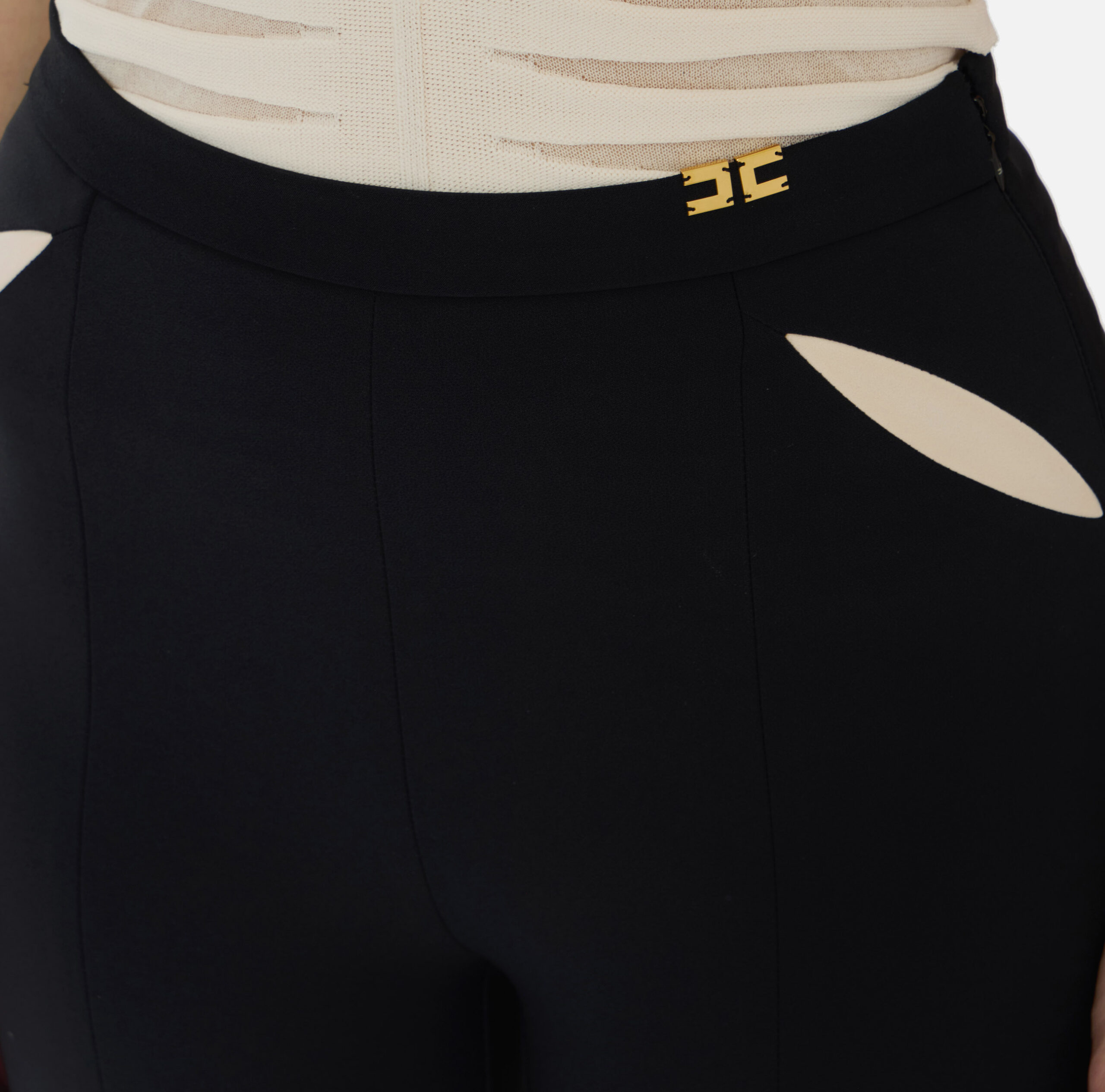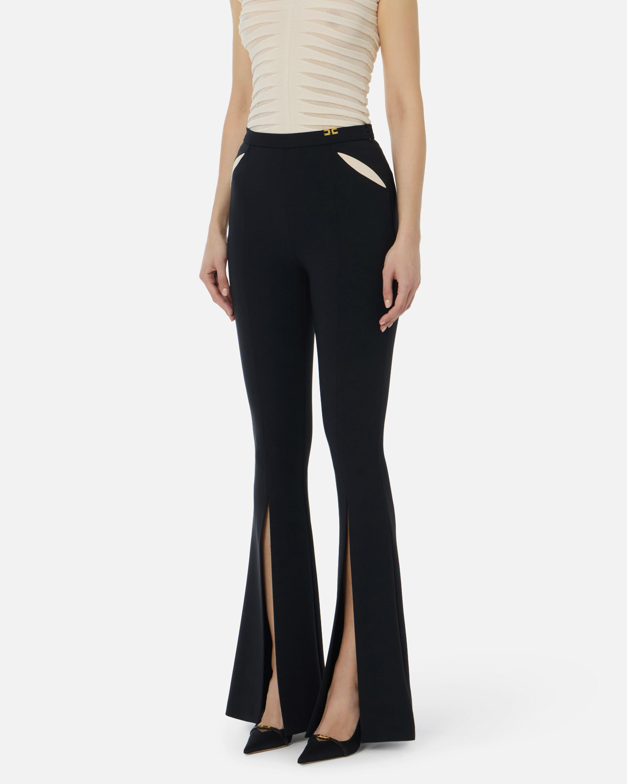 Pantalón de crepé ligero. Los laterales se definen con cut-out superpuestos sobre tejido bicolor, que recrean un entramado geométrico. En la cintura brilla un detalle con logotipo de metal dorado. Las aberturas en el bajo estilizan la figura y marcan la silueta. Talla adherente.