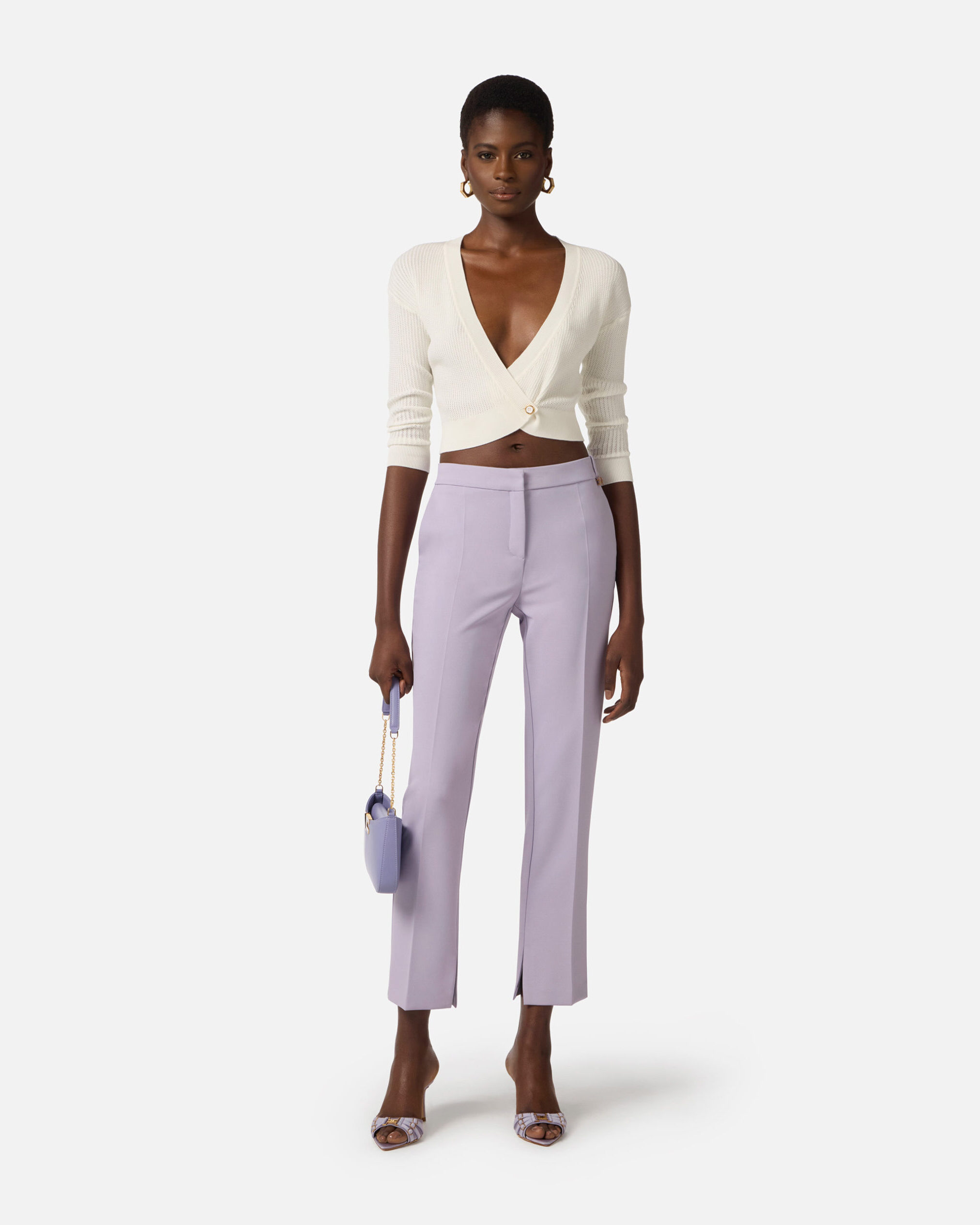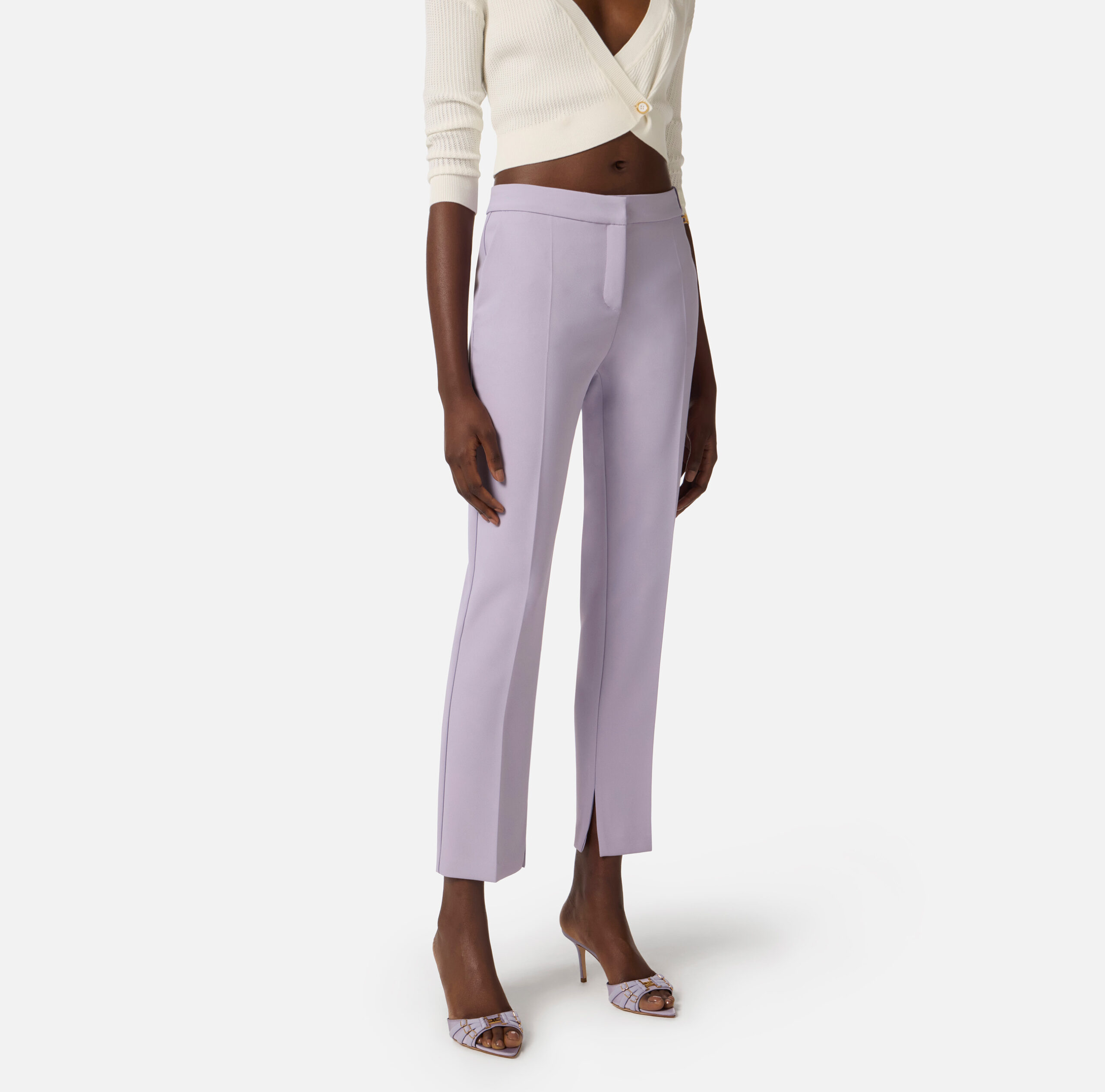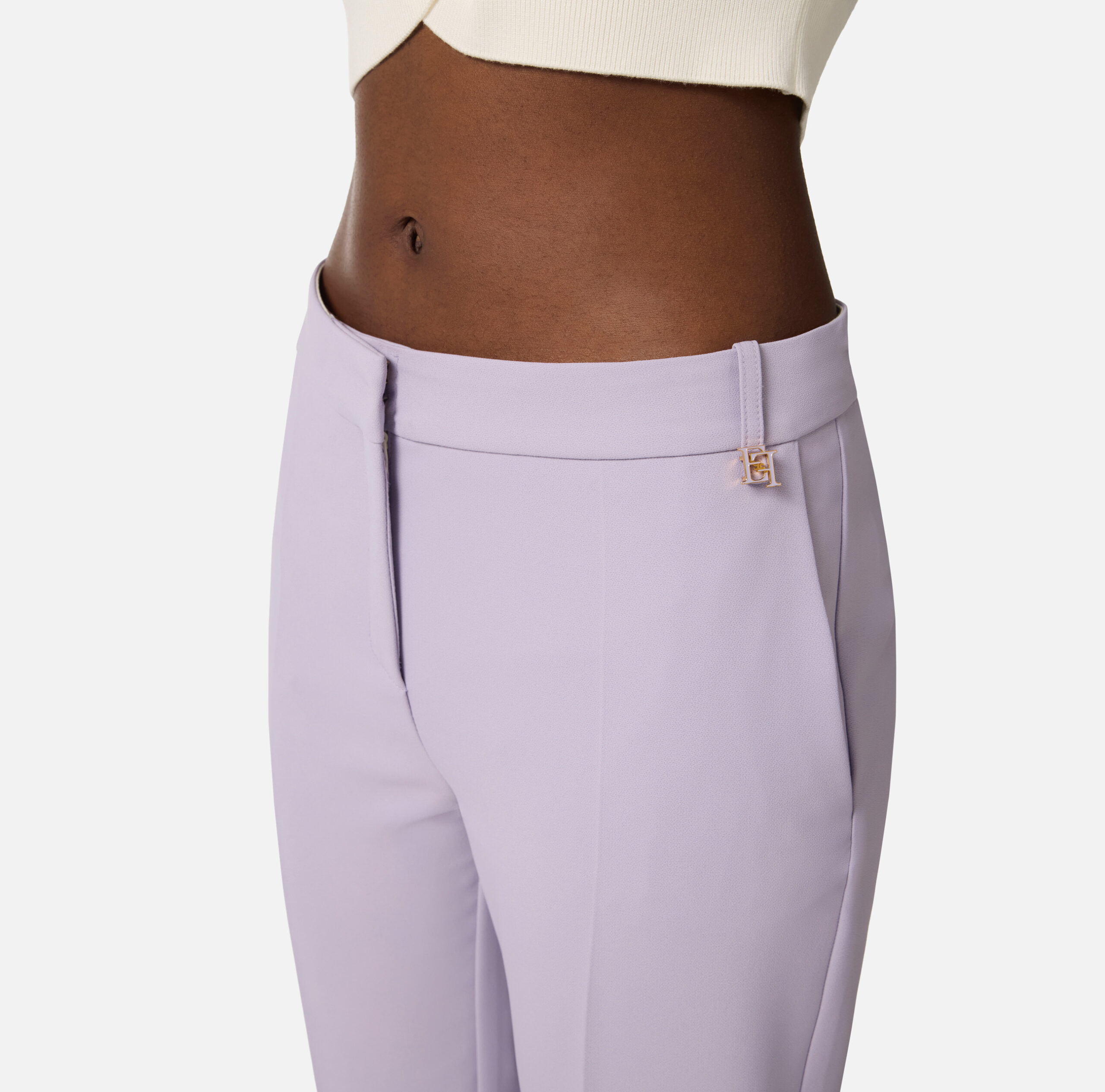 Pantalón de crepé ligero. Con bolsillos franceses y pliegue central, están adornados con el detalle de un dije con logotipo en una trabilla. Talla adherente. Forma parte de la colección Essential, para armar el guardarropa perfecto.
