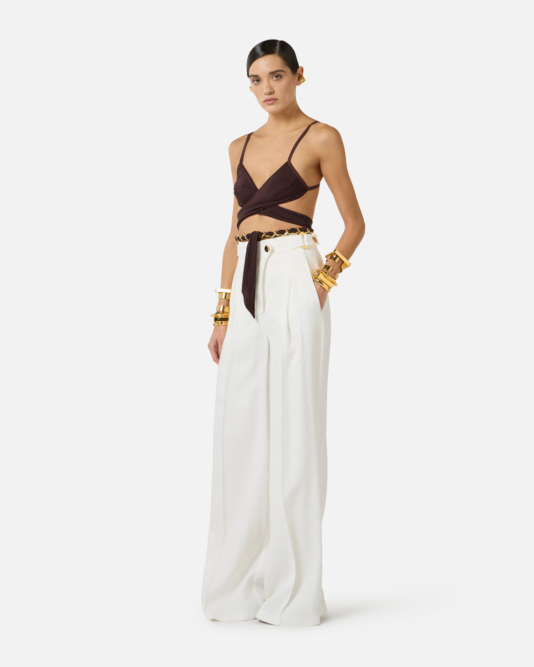 Pantalón de tiro alto de mezcla de lino. Con amplios volúmenes tipo palazzo, presentan una cinturilla ancha definida por tiras con anillas de metal dorado que aportan un toque de luz. La bragueta con corte diagonal es el detalle de estilo. Talla oversize.