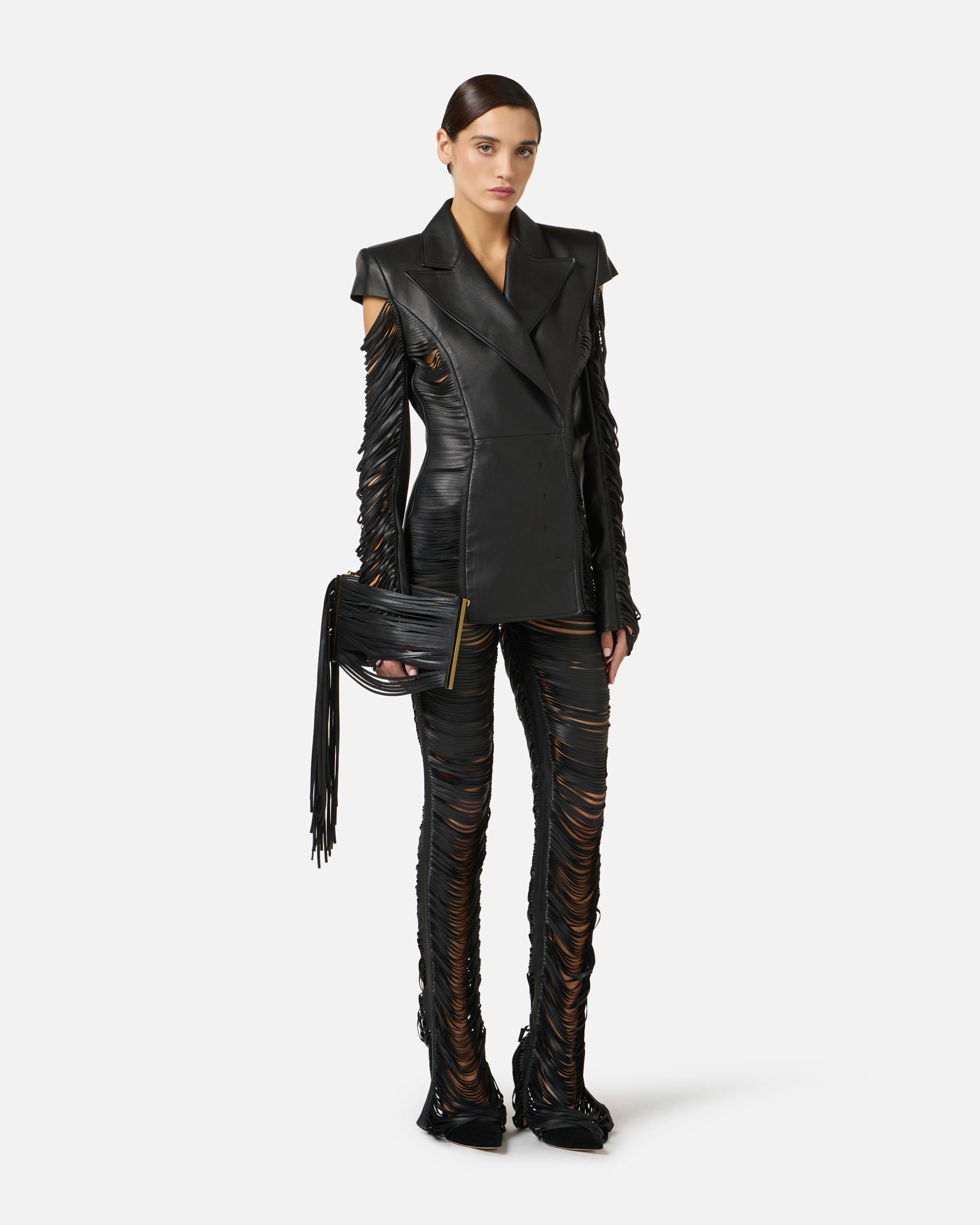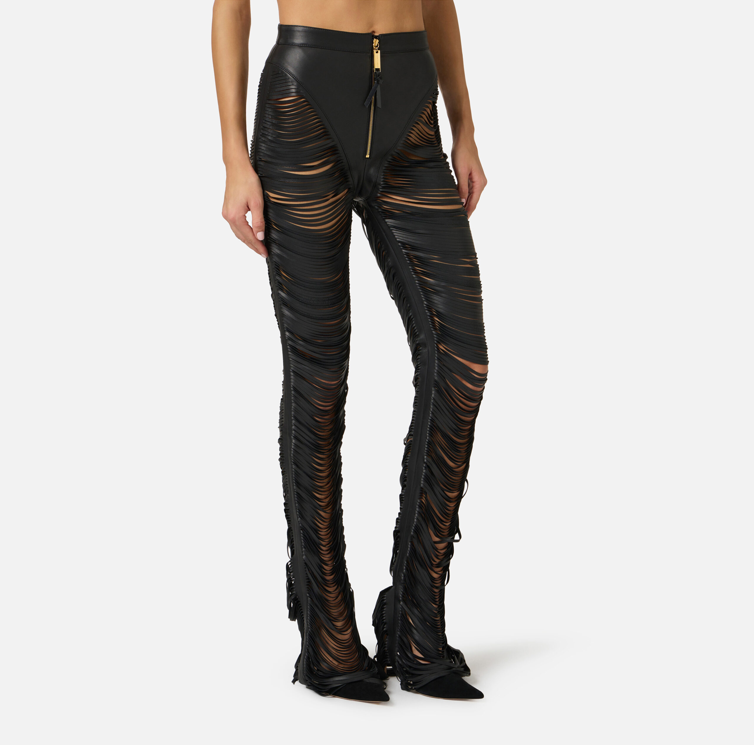 Pantalón de napa. El modelo destaca por la textura con flecos insertados en los cortes, que caen suavemente creando originales efectos de volumen y tridimensionalidad. Talla regular.