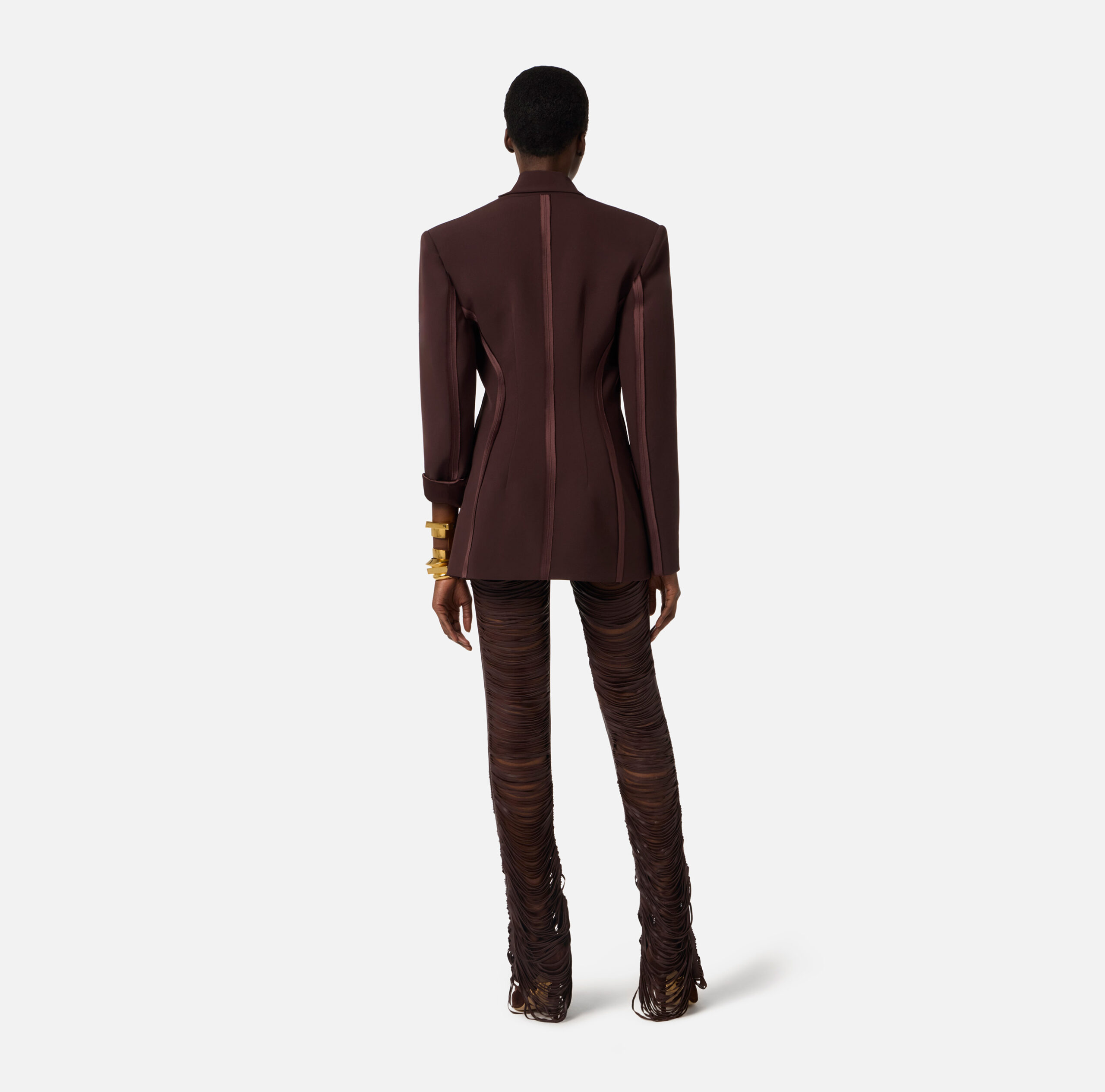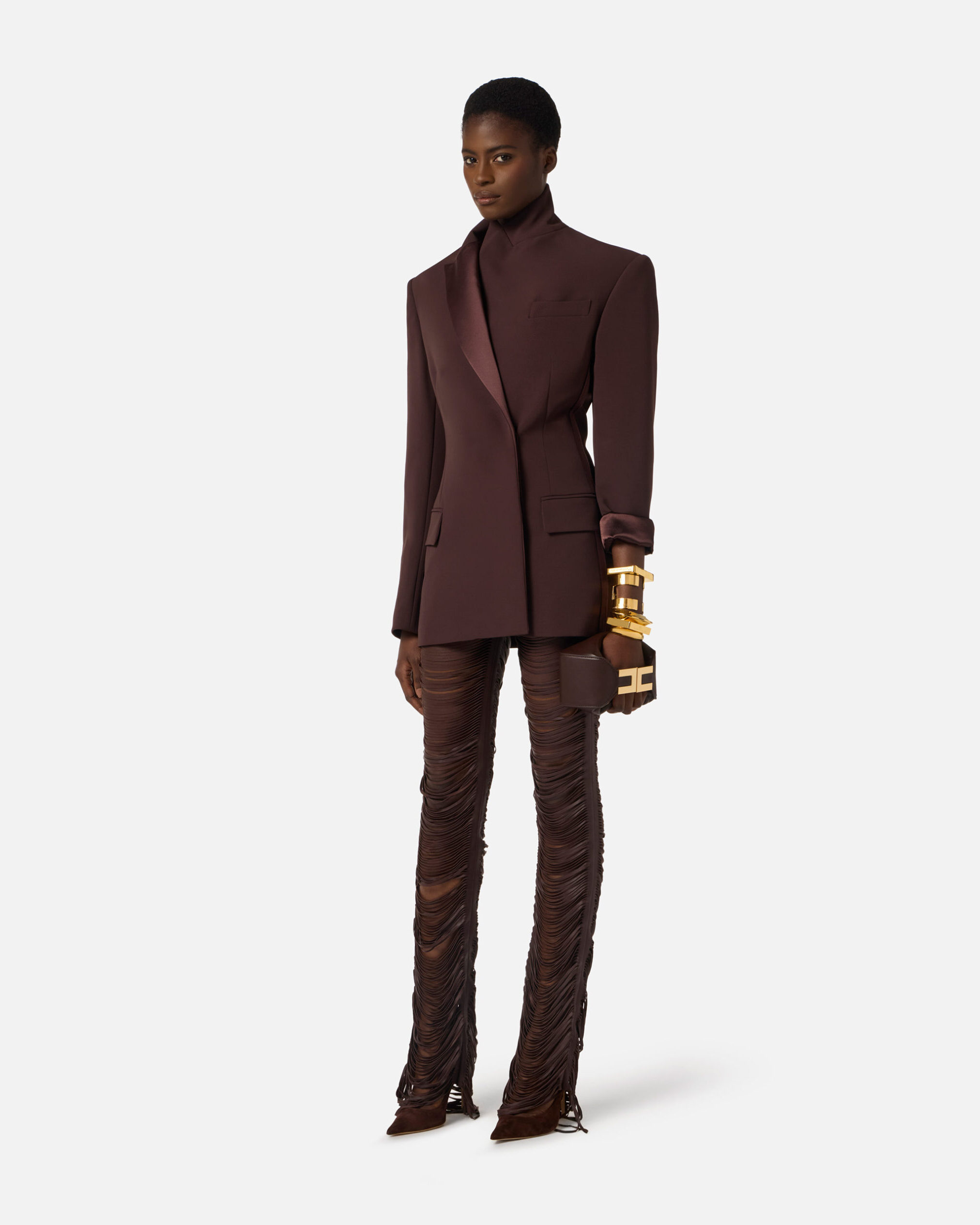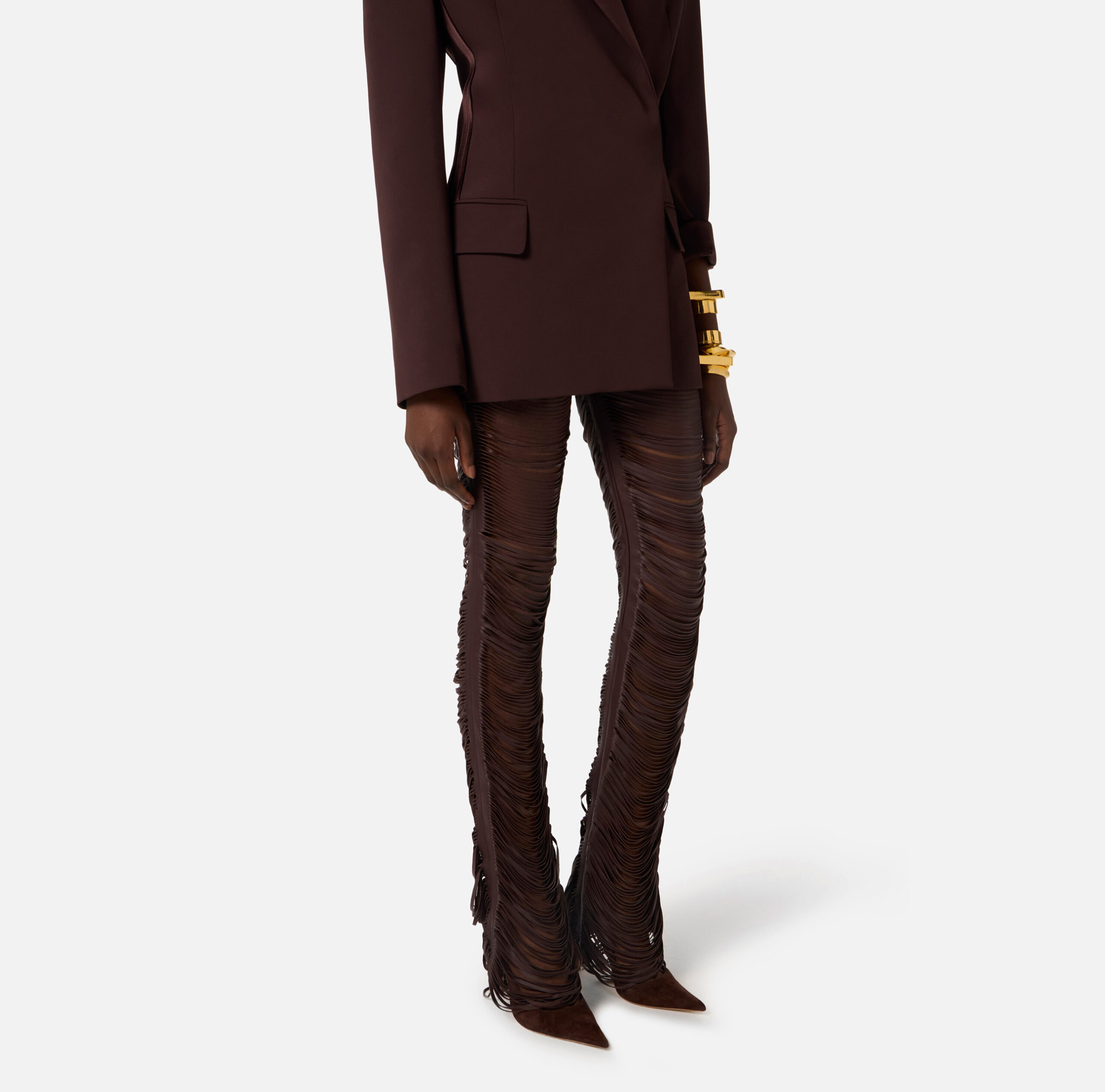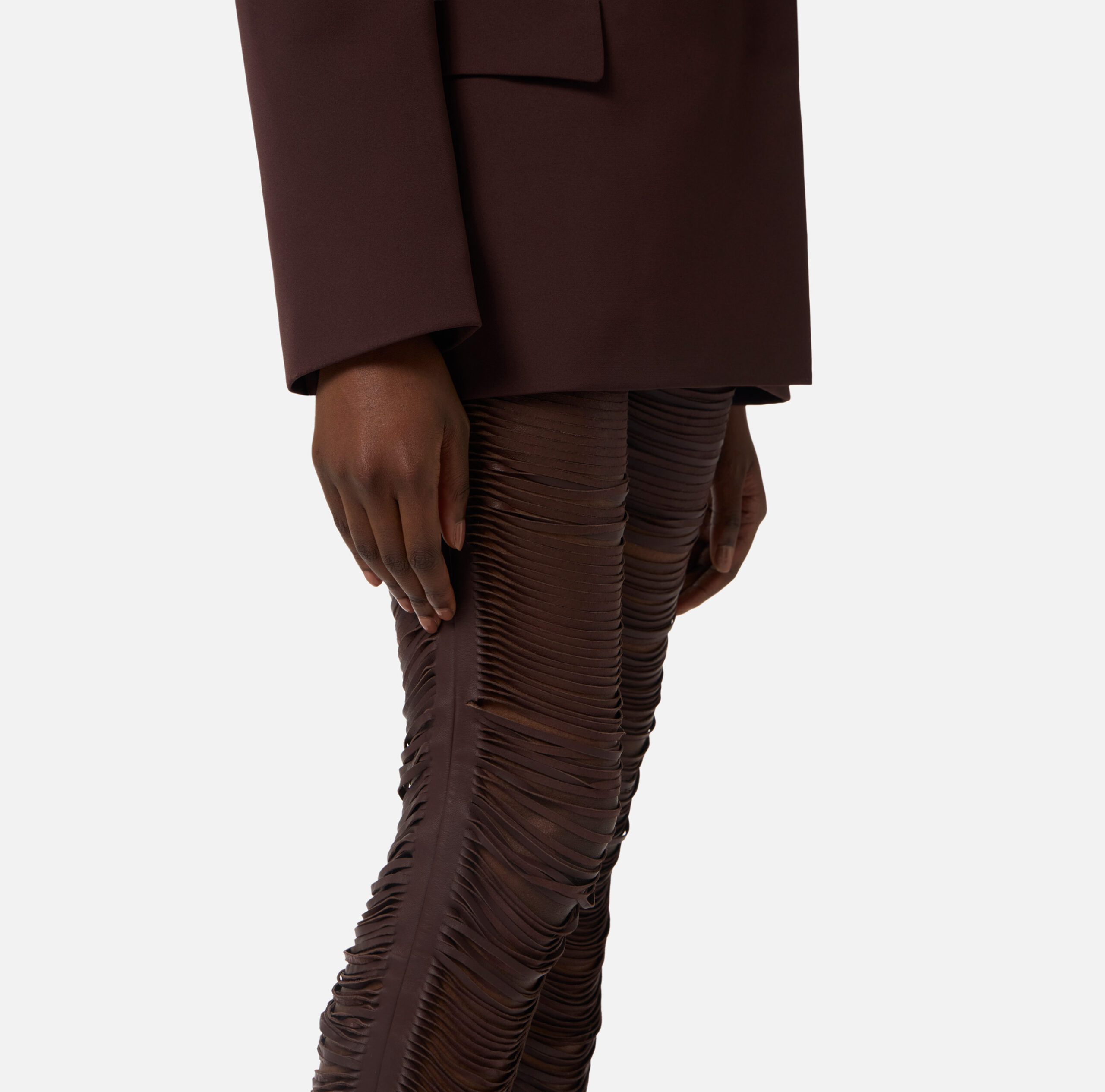 Pantalón de napa. El modelo destaca por la textura con flecos insertados en los cortes, que caen suavemente creando originales efectos de volumen y tridimensionalidad. Talla regular.
