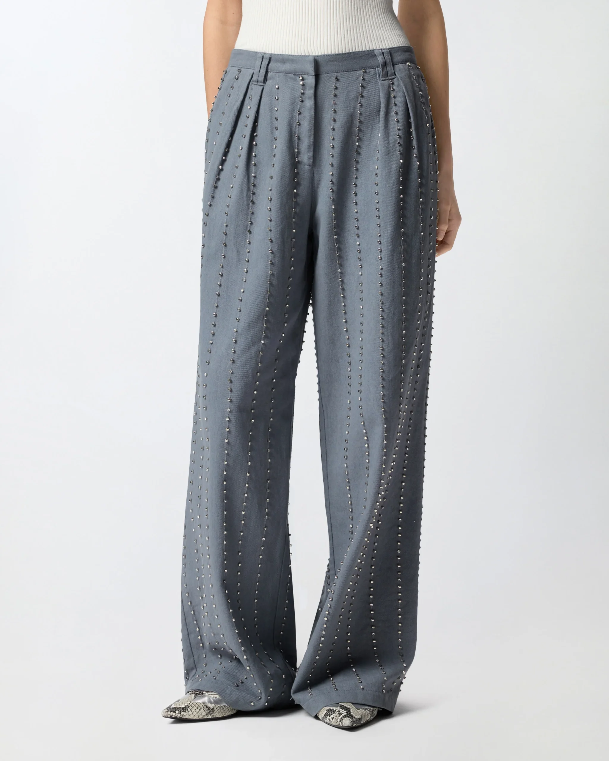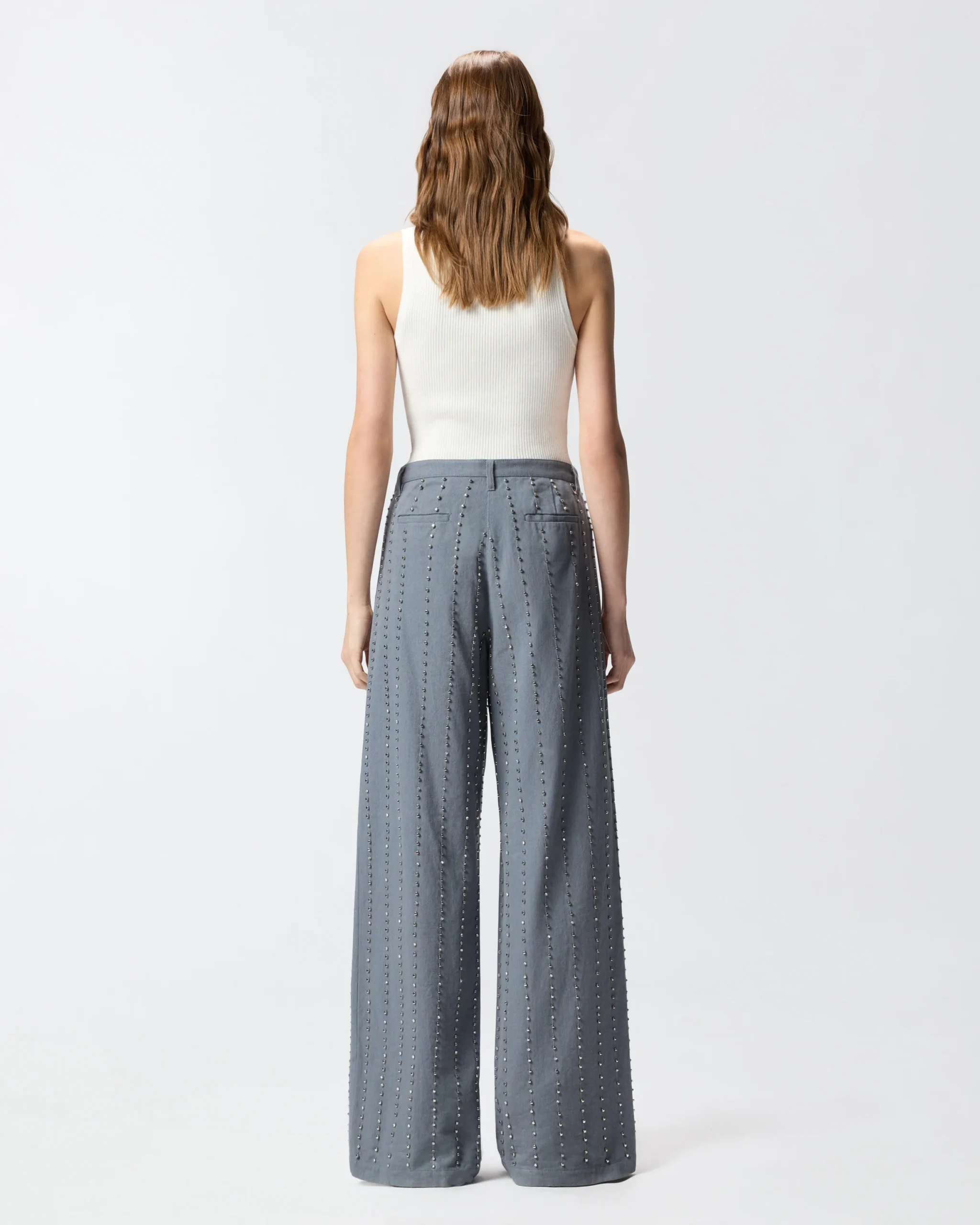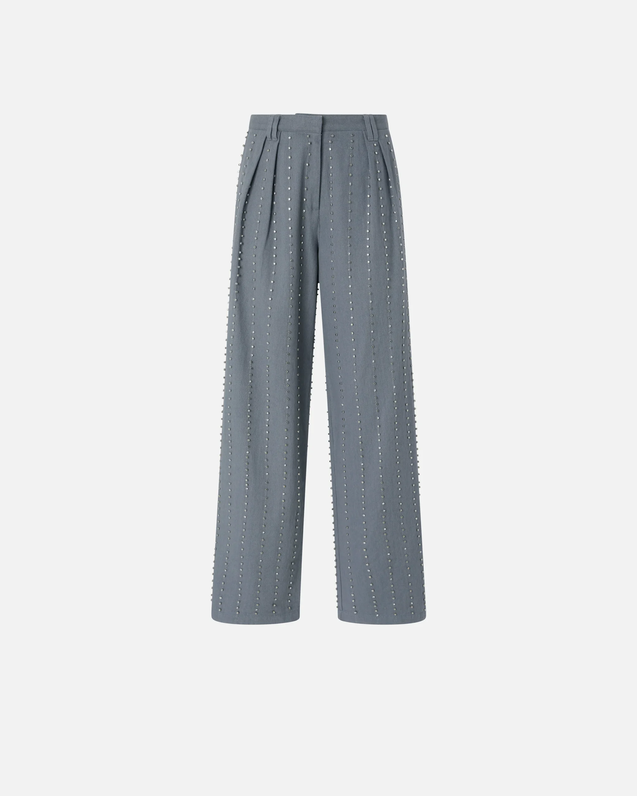 Pantalones confeccionados en sarga de algodón puro con un aspecto grueso y fluido, con bolsillos laterales, bolsillos de ribete traseros y elegantes pliegues delanteros. La prenda se siente como una auténtica joya gracias a su distintivo diseño de raya diplomática, creado alternando pequeños elementos metálicos en forma de cubo y cristales bordados a mano. El modelo está forrado para mayor comodidad.