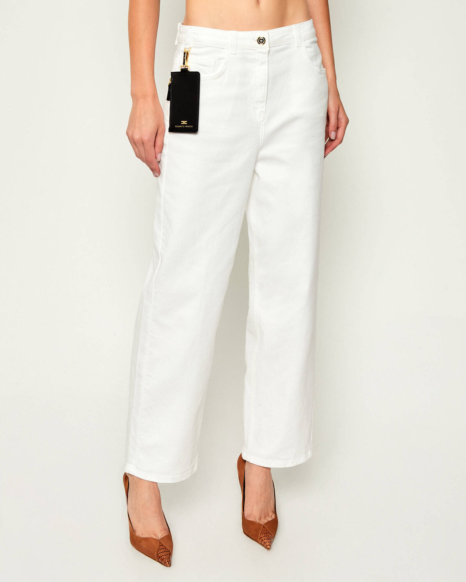 Pantalón de denim en dril de algodón con confección boyfriend de tiro alto, pernera ancha y largo hasta el tobillo. El detalle de estilo es la trabilla descentrada, adornada con estuche con cremallera sujeto por la anilla de metal dorado con logotipo. La etiqueta en la parte trasera completa la prenda. Talla regular.