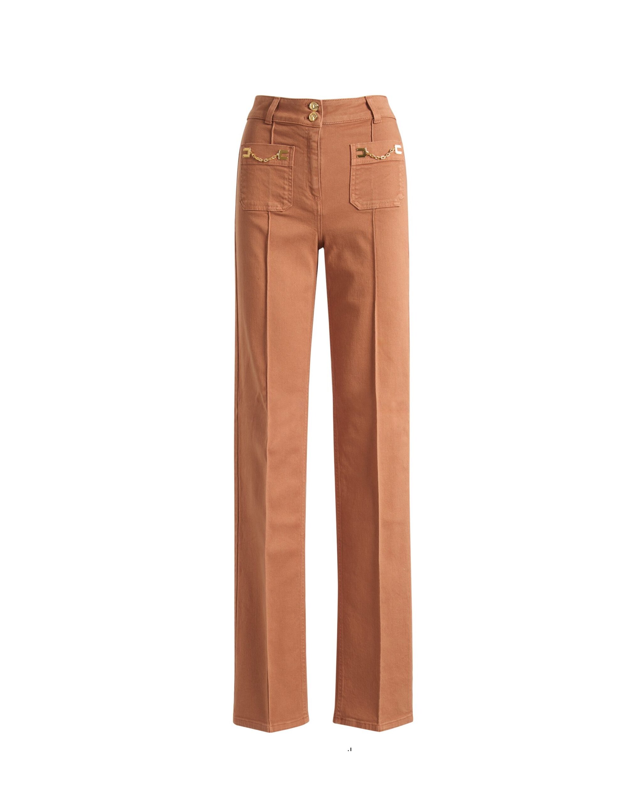 Pantalón de denim con confección de pata ancha. Se distingue por los bolsillos delanteros con solapa, iluminados por los botones de metal dorado y por una placa con logotipo en la parte trasera. Talla adherente.
