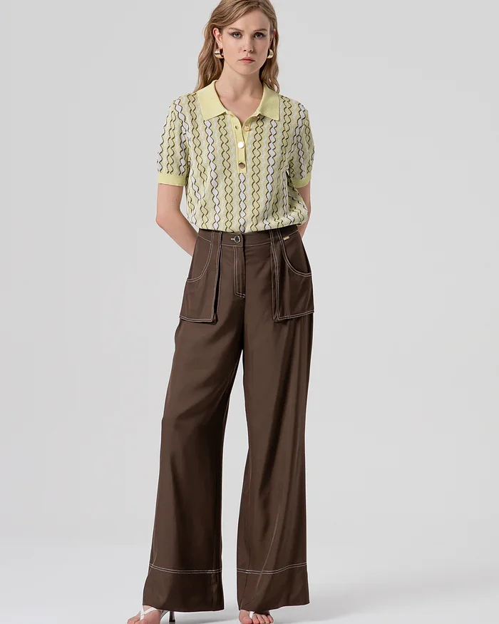 Pantalón palazzo acampanado de viscosa. Cintura regular, bolsillos de parche en la parte delantera y pernera ancha.