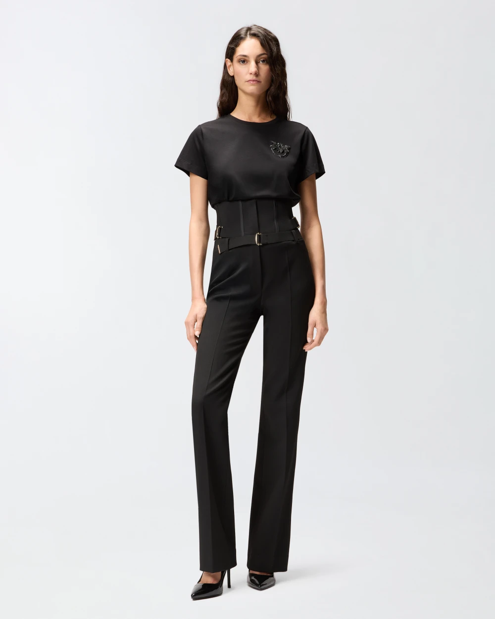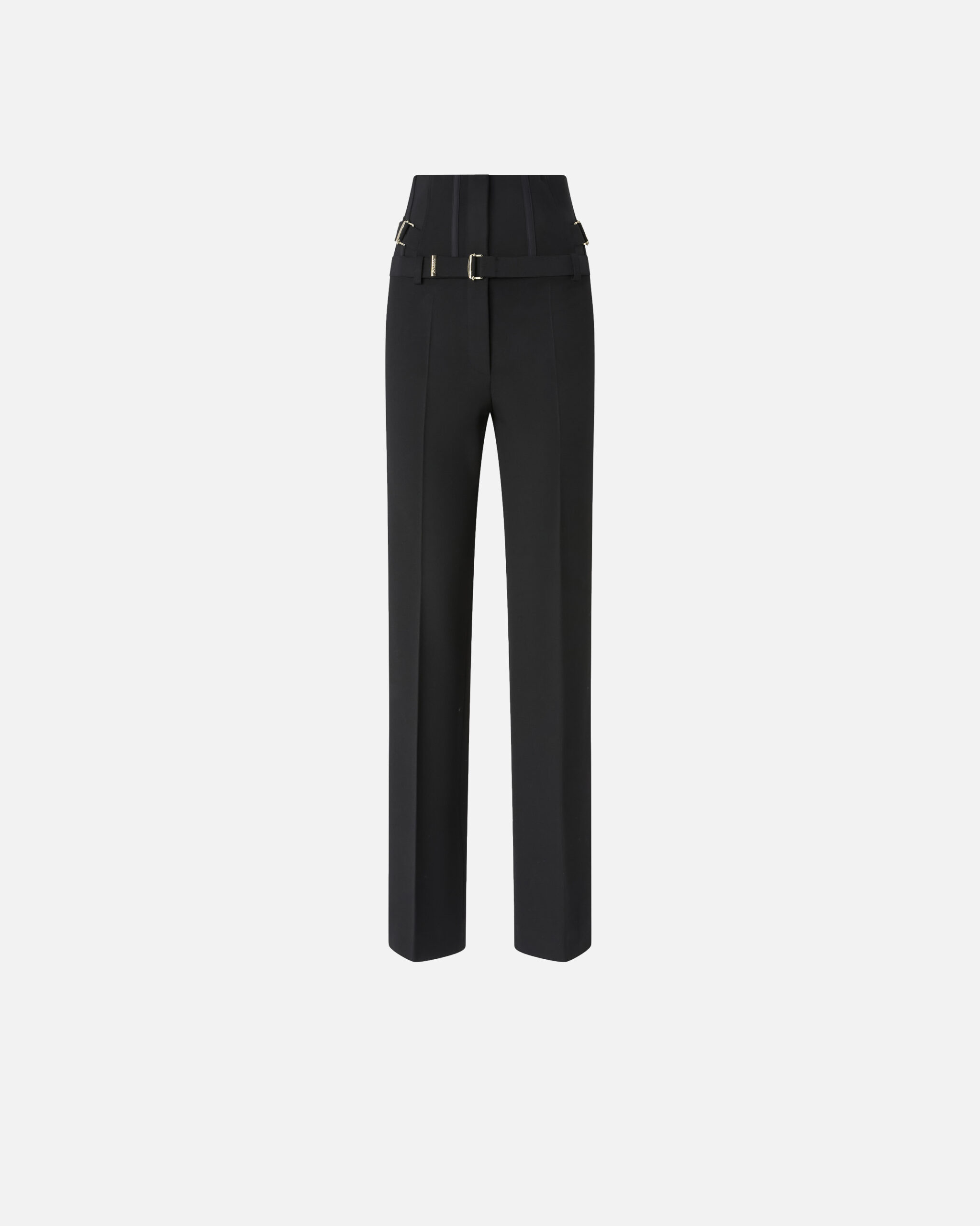 Pantalones con pernera recta caracterizados por un diseño de cintura muy alta con ballenas que recuerdan a los corsés femeninos. El crepé de poliviscosa, un tejido doble particularmente versátil y práctico gracias a la confección bielástica, ha sido sometido a tratamientos de alta calidad que permiten obtener un sofisticado aspecto de lana. Completan el modelo las trabillas para el cinturón, las correas en la cintura para regular el ajuste según tus necesidades y el cierre frontal oculto. Combinación equilibrada entre lo masculino y lo femenino, estos pantalones harán que tus looks más formales de la nueva temporada resulten especiales.