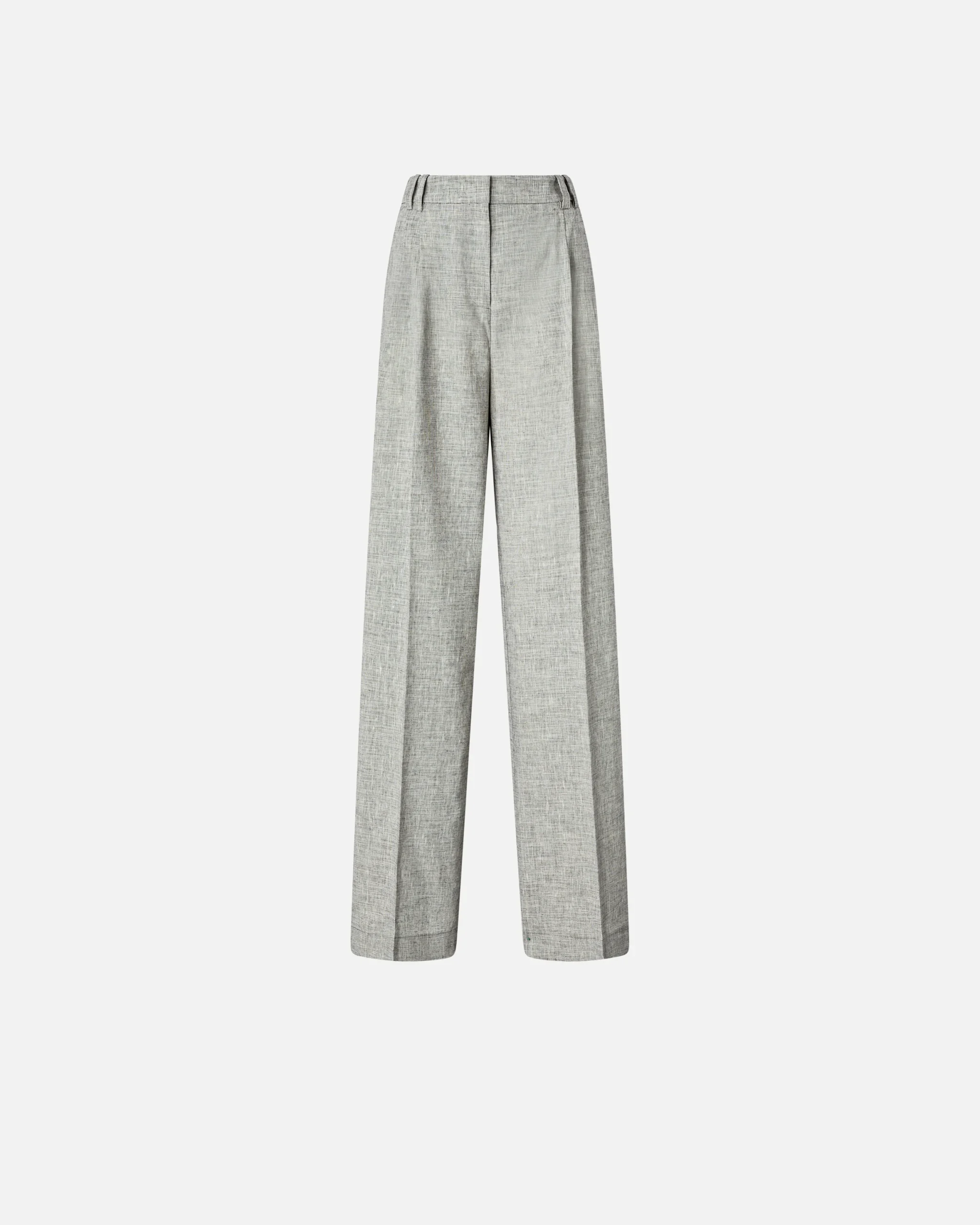 Pantalones confeccionados en mezcla de algodón y lino flameada fil-à-fil teñida en hilo, un tejido con un acabado ligeramente irregular y moteado que crea un refinado efecto óptico bicolor. La prenda presenta un diseño de pernera recta con raya marcada en el centro, dos bolsillos traseros de ribete, trabillas para el cinturón y un elegante cierre delantero oculto. Sencillo y actual, este modelo se convertirá en un auténtico básico en tu armario.