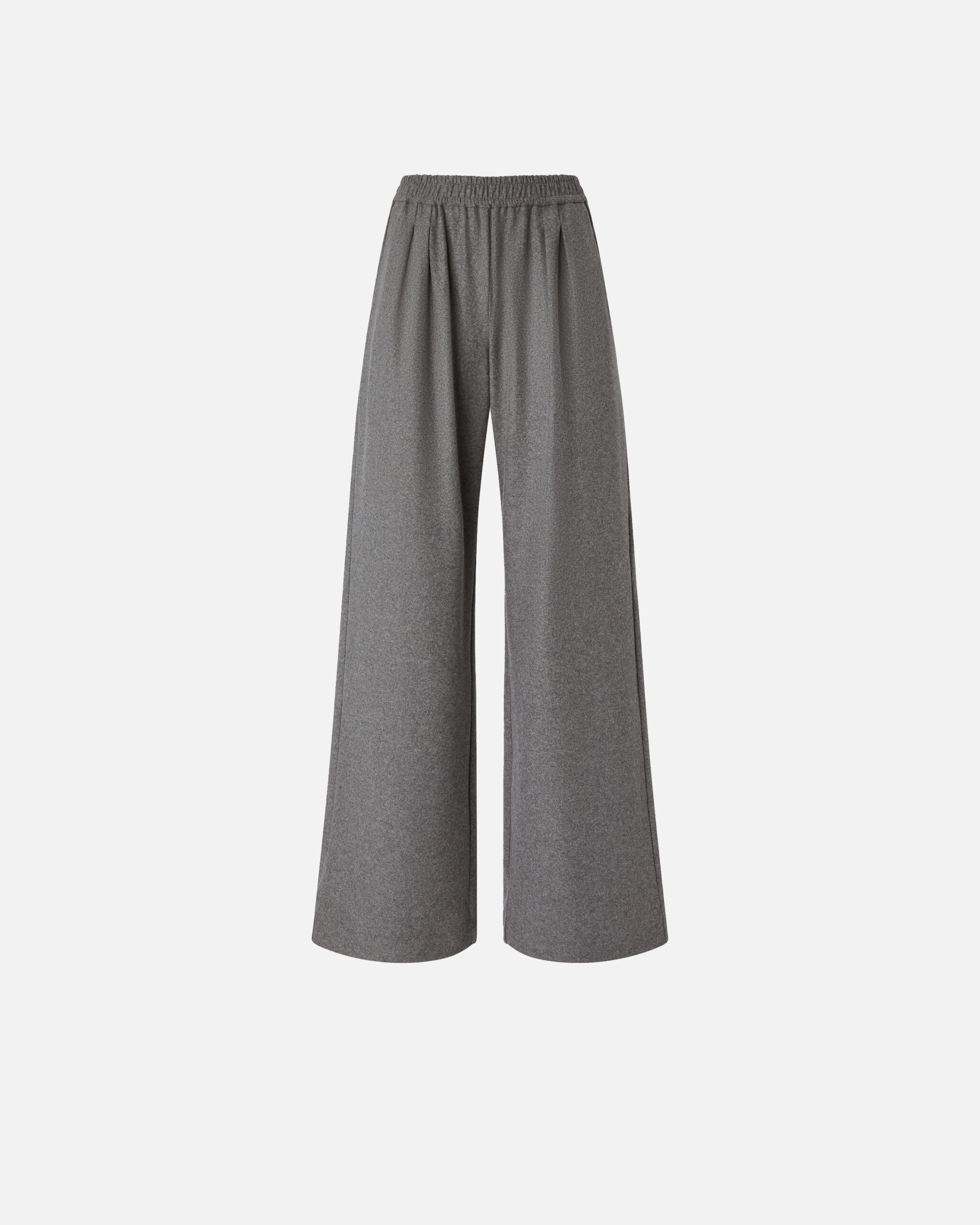Pantalones largos confeccionados en franela de punto de mezcla de lana teñida en hilo, un tejido perfecto para combinar suavidad, elasticidad y comodidad, y caracterizados por una línea wide-leg con pernera acampanada en el bajo. El modelo es cómodo y funcional gracias a la cintura elástica, pero introduce una referencia al estilo sastre con un detalle plisado en la parte delantera y con los discretos bolsillos de ribete en la parte trasera. Estos pantalones de pernera ancha son los nuevos imprescindibles de los looks formales y elegantes, tanto para estilismos mixtos como para crear un nuevo concepto de traje.