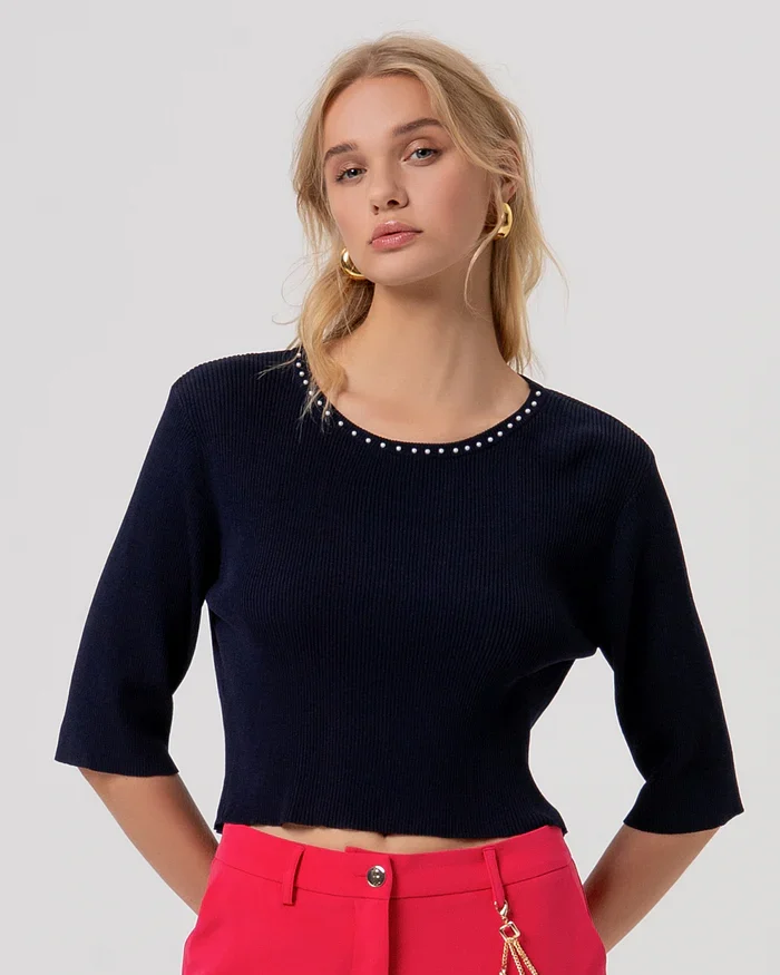 Prenda de punto corta con canalé. Cuello redondo con aplicaciones brillantes y mangas cortas.