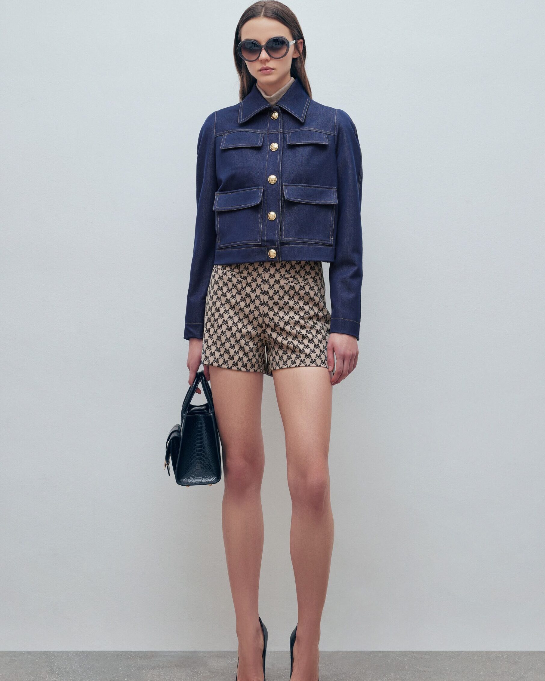 Descubre estos elegantes shorts beige con un distintivo estampado geométrico, perfectos para un look moderno y versátil. Diseñados con un corte cómodo y estilizado, se combinan idealmente con una chaqueta denim azul y tacones altos para un outfit urbano sofisticado. Ideales para la temporada actual, estos shorts destacan por su diseño único y su capacidad de adaptarse a diferentes estilos. Perfectos para amantes de la moda contemporánea.