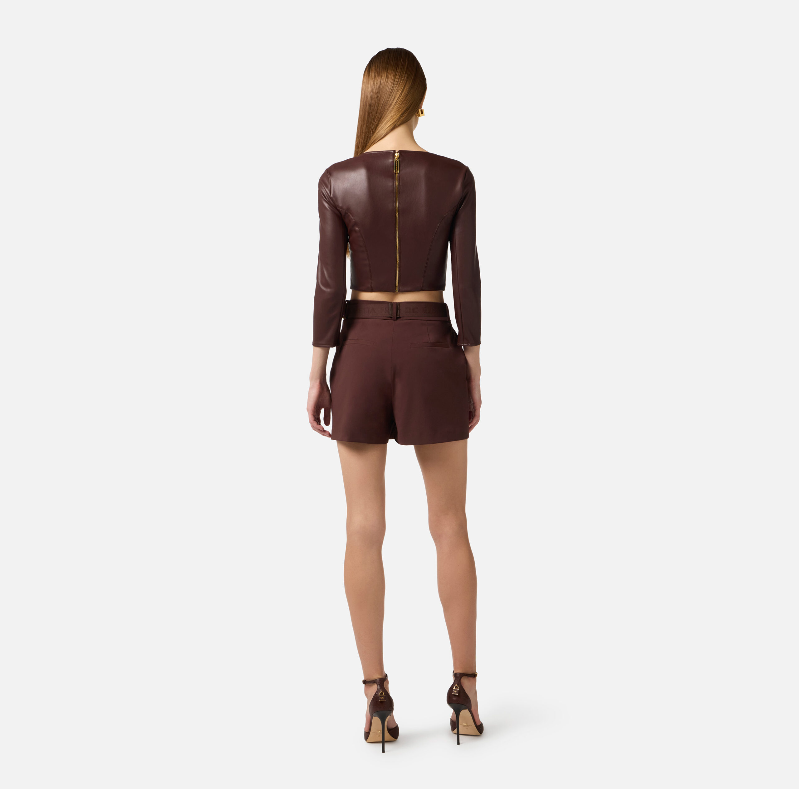 Shorts de tela técnica bielástica. Cuenta con bolsillos franceses y costuras que definen la figura por delante. Los protagonistas son los detalles: el cinturón realza la cintura y se ilumina con la placa con logotipo grabado con láser. Talla adherente.