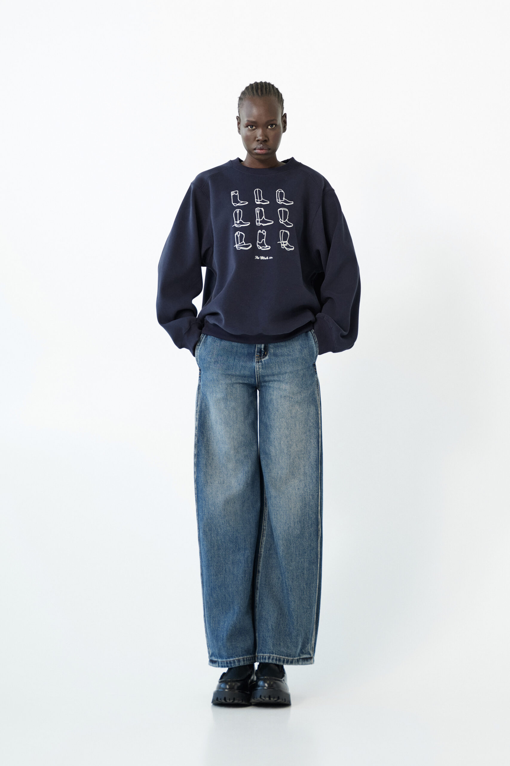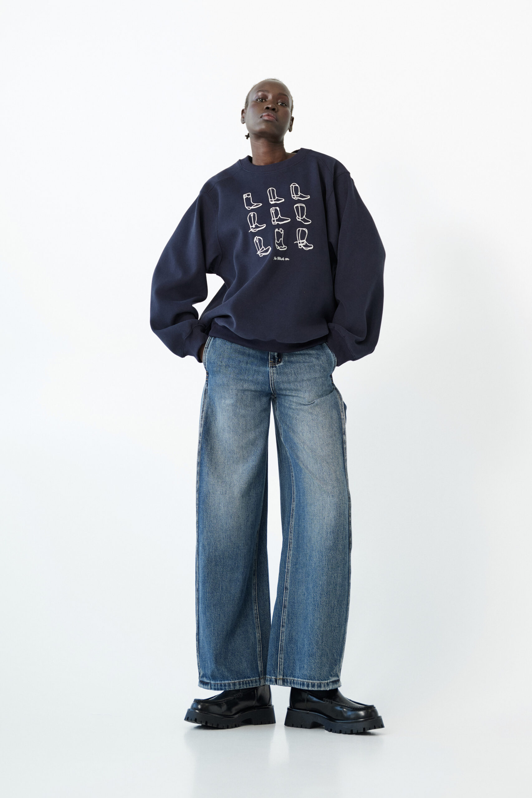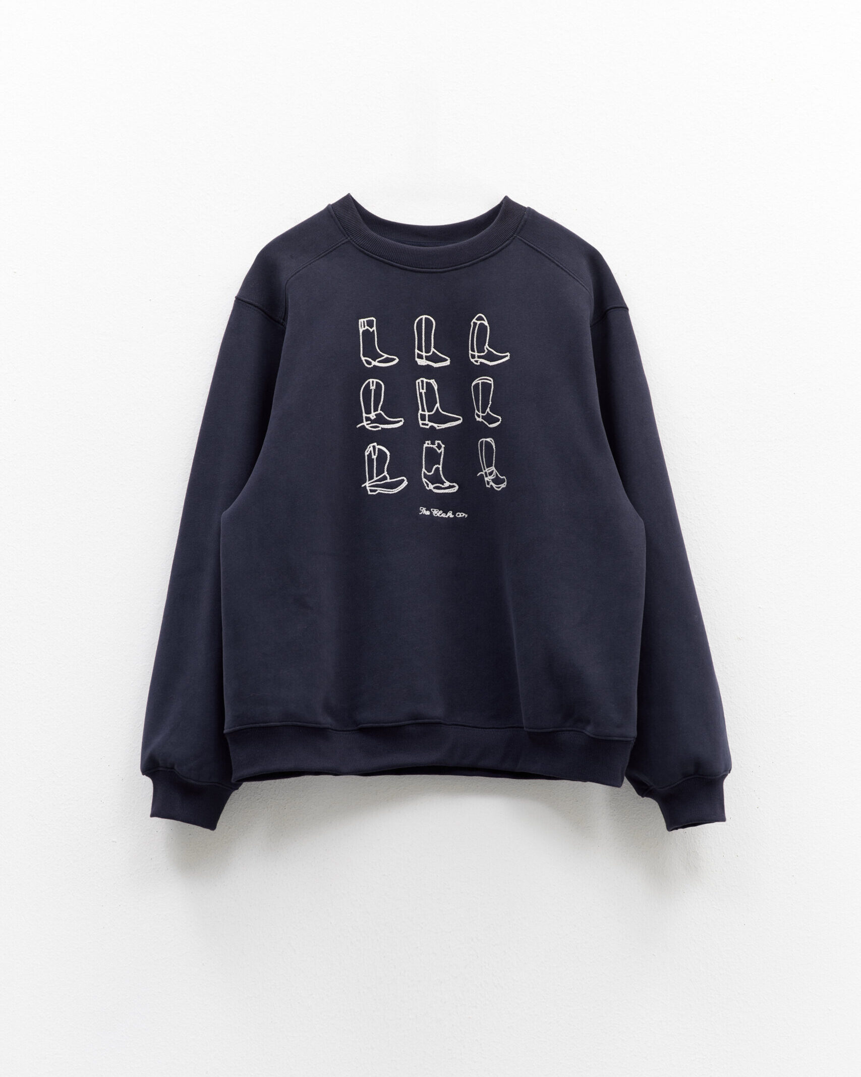 Este cómodo sudadera para mujer presenta un diseño casual en tono azul oscuro. Destaca por su estampado frontal de botas blancas dibujadas en diferentes poses, acompañado de un texto sutil, lo que le da un toque divertido y único. Con cuello redondo, mangas largas y puños elásticos, es ideal para un look relajado y moderno.