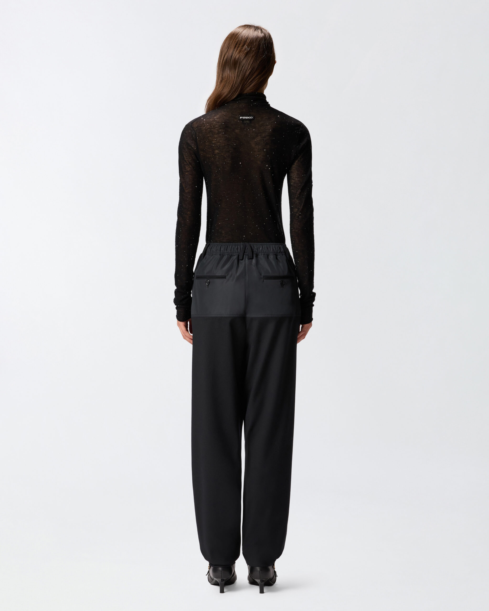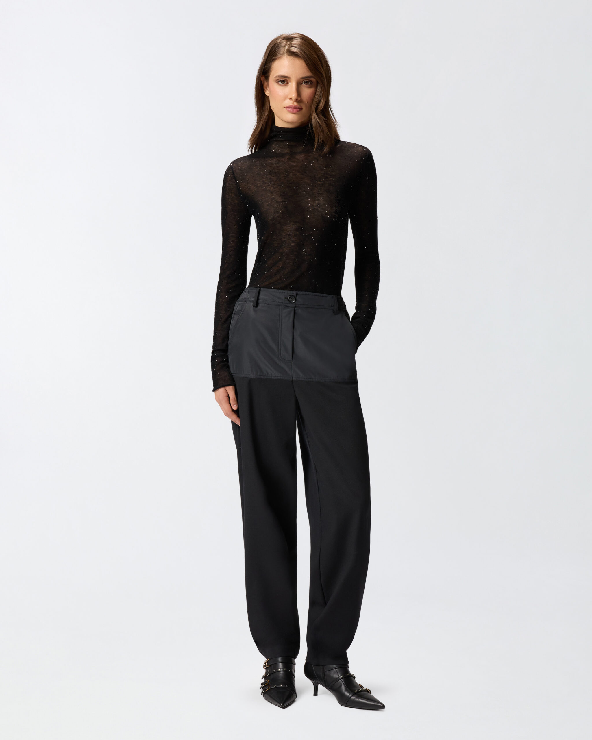 Suéter de manga larga confeccionado en una mezcla de lana semitransparente: un hilo ligero y suave, casi impalpable, que crea un look sensual y original. El diseño está adornado con microlentejuelas insertadas en el hilo y logra un brillo sutil y una gran comodidad. El corte ajustado del suéter de cuello alto se complementa con la etiqueta de la marca en el centro de la espalda. La prenda ha sido sometida a pruebas de acabado para minimizar la formación de bolitas, garantizando así una mayor suavidad y durabilidad del tejido.