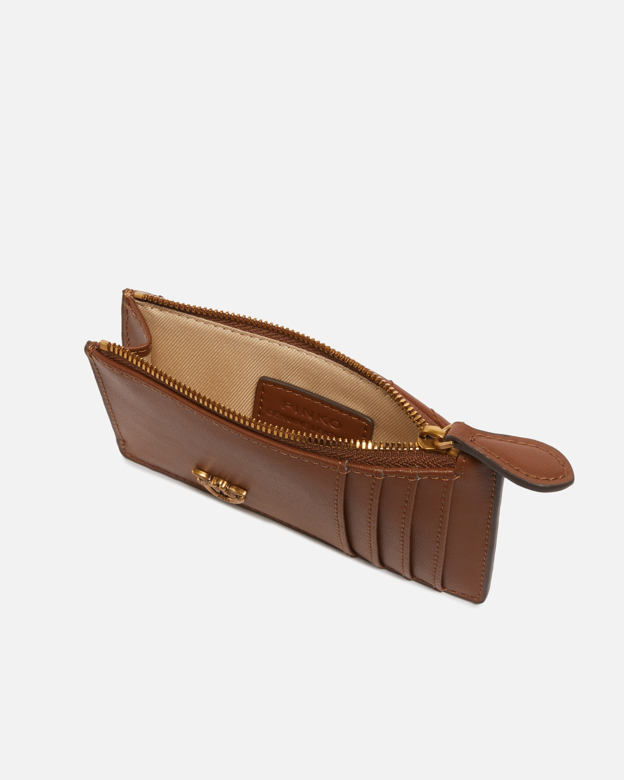 Tarjetero de napa acolchada con motivo de chevrón. Adornado con placa de metal con logotipo Love Birds Diamond Cut. El interior está forrado de polialgodón. Cierre con cremallera.