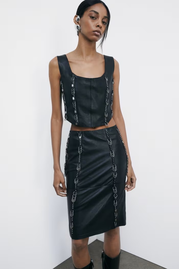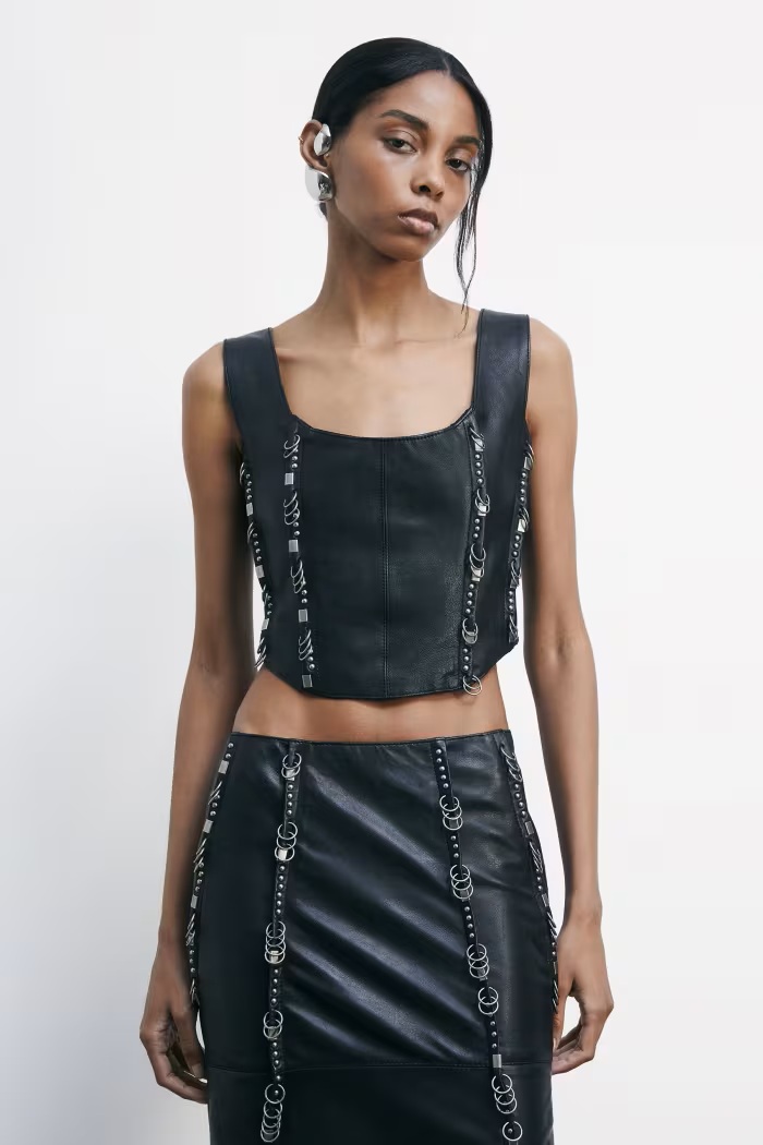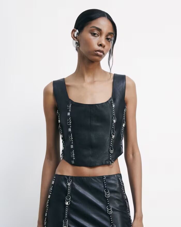 - Elaboración con piercings y tachuelas en los cortes delanteros para un efecto corsé