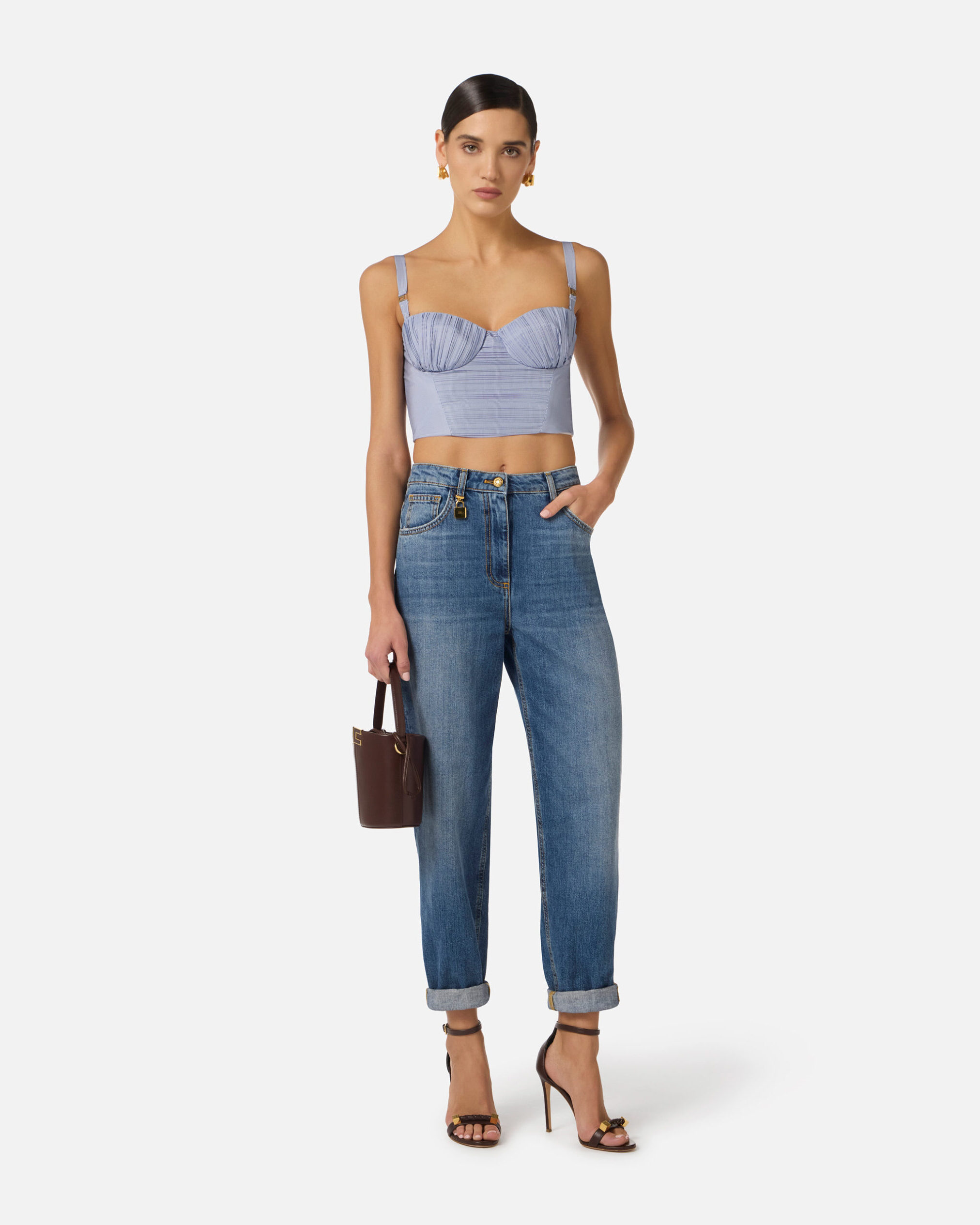Top de tafetán de nailon con tirantes y copas. Se distingue por el estampado con patrón a rayas, dispuesto en líneas asimétricas y enriquecido con plisados para una ligereza dinámica. Adornado con detalles con logotipo. Talla adherente.