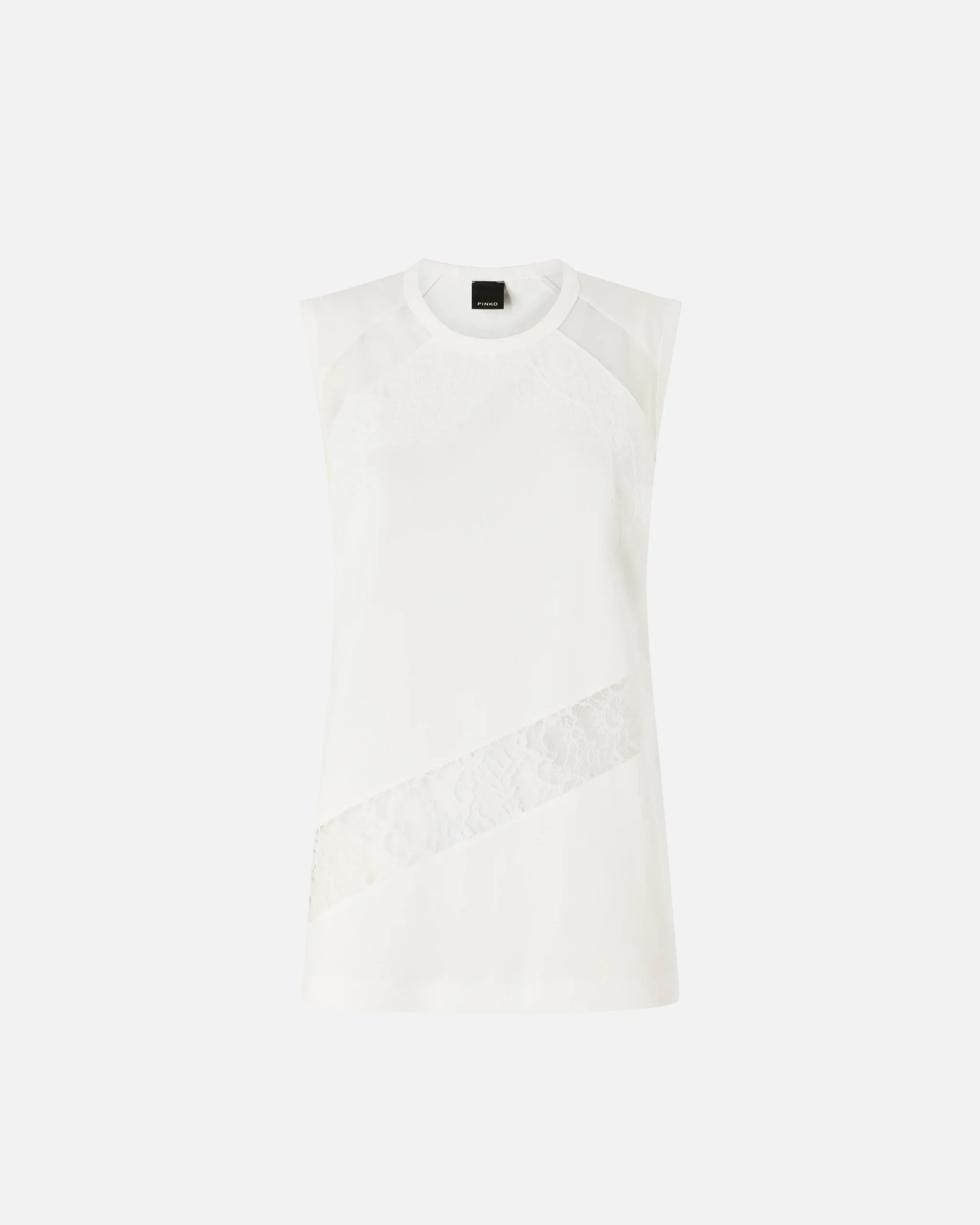 Top de cuello redondo sin mangas en punto de algodón caracterizado por un juego de aplicaciones transparentes y detalles de encaje. Gracias a su diseño versátil y, a la vez, elegante, es la prenda perfecta para llevar debajo de la chaqueta combinada con pantalones sastre, pero también con unos vaqueros especiales.
