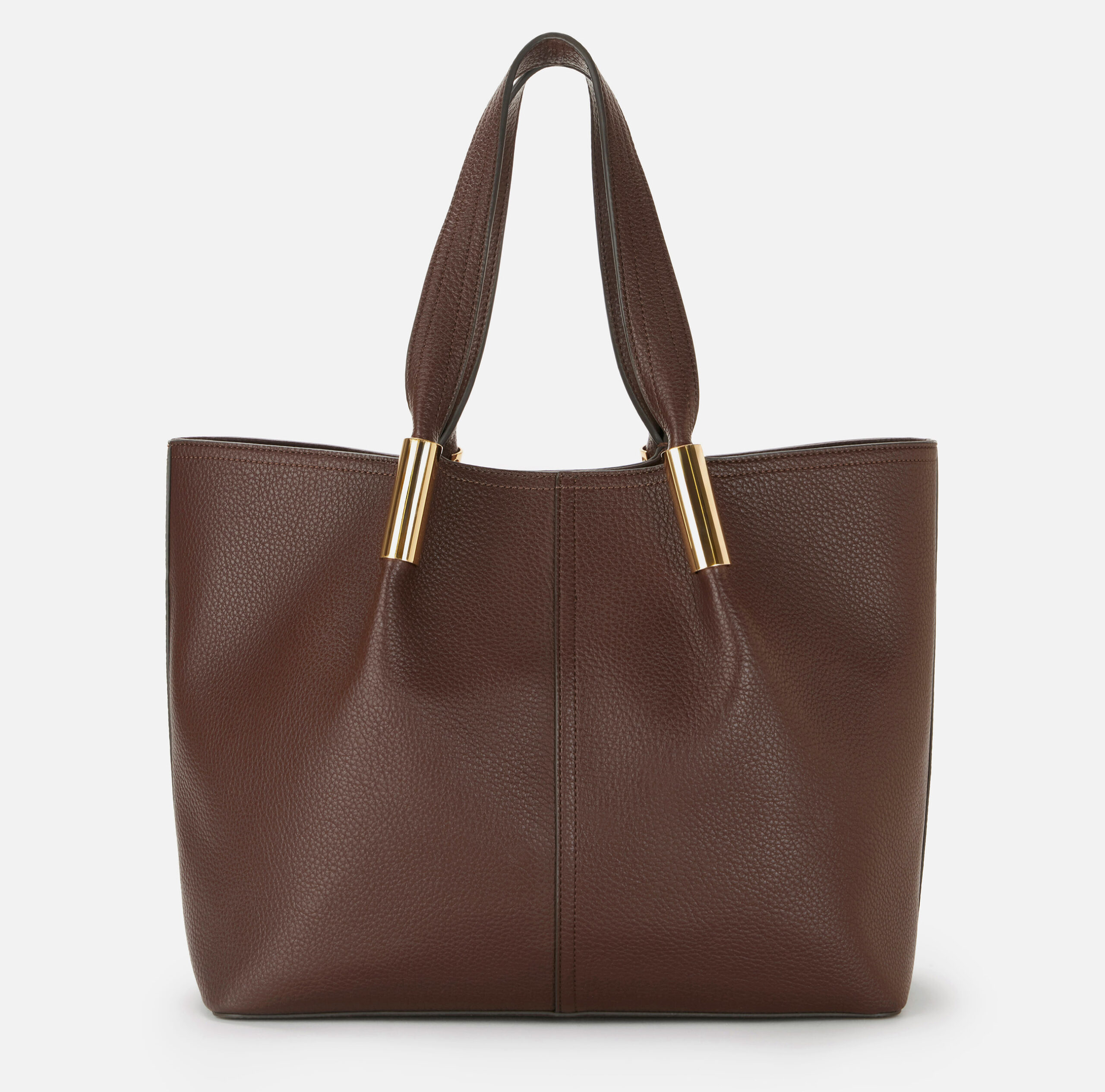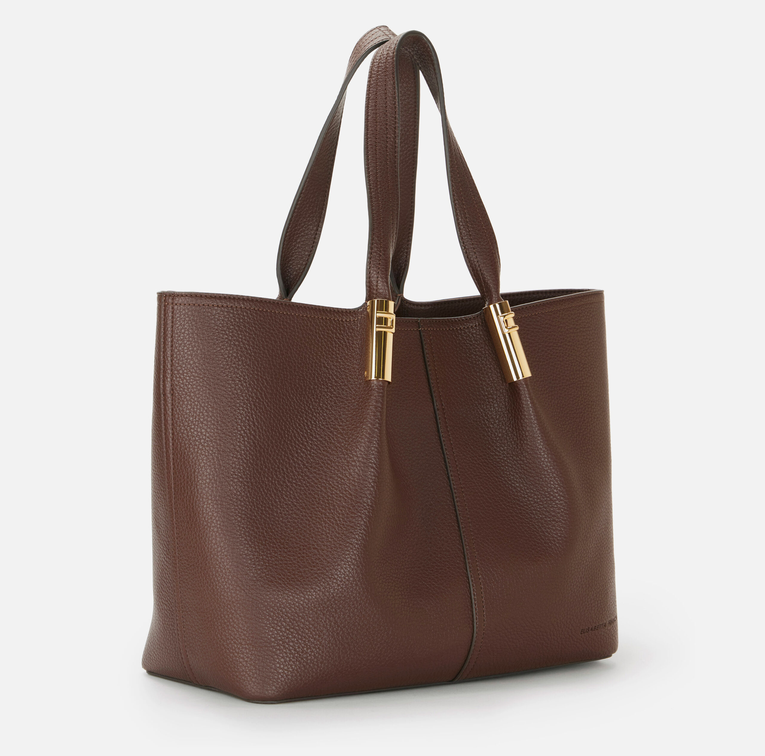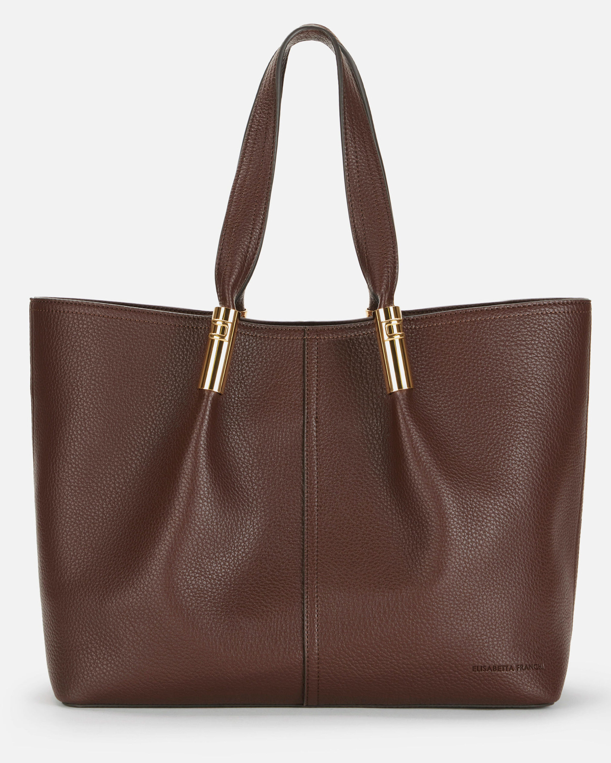 Bolso tote grande hecho de material sintético efecto piel. Con su forma esencial y elegante, es adornado con detalles de metal dorado con logotipo. Logotipo en el fondo