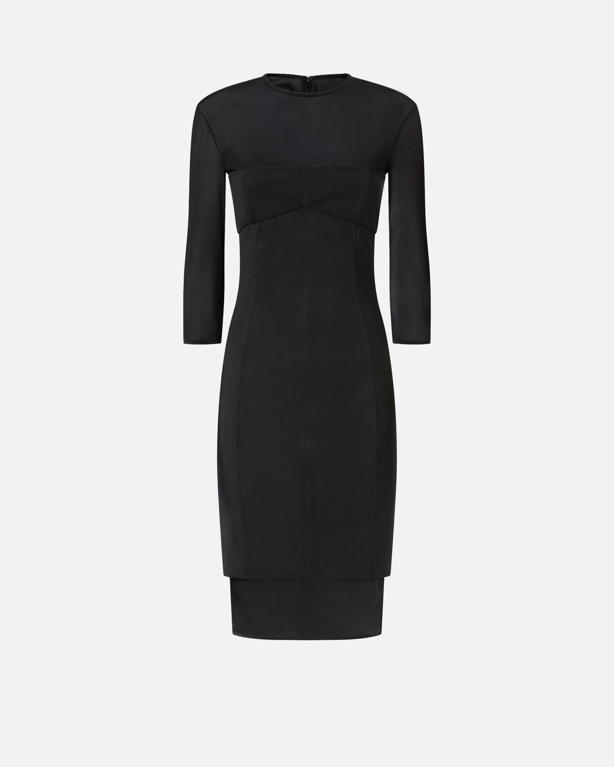 Vestido a la rodilla de corte ceñido con manga larga y cremallera que recorre toda la espalda. El tejido se caracteriza por una gran elasticidad y confiere a la prenda un efecto modelador, realzando las formas de modo natural y armonioso. La prenda garantiza una comodidad óptima, envolviendo el cuerpo sin comprometer la libertad de movimiento y ofreciendo un ajuste que realza la figura con discreción y elegancia. Las transparencias en los brazos y el pecho completan el conjunto, creando un look sensual y refinado.