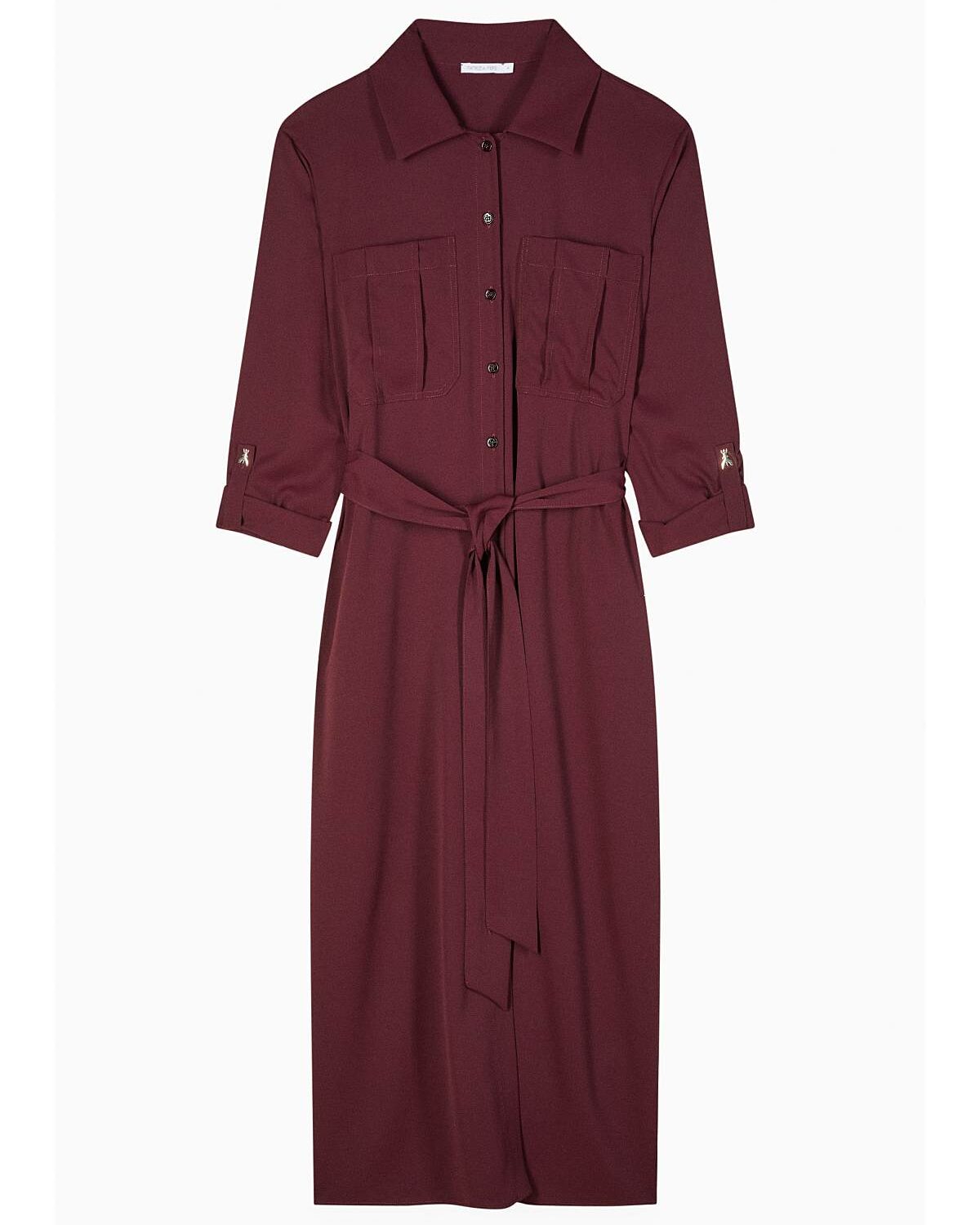 Vestido camisero Sarga mate fluida Tejido firme Corte regular Hombros caídos Largo midi Manga larga Cierre de botones Cinturón de tela desmontable