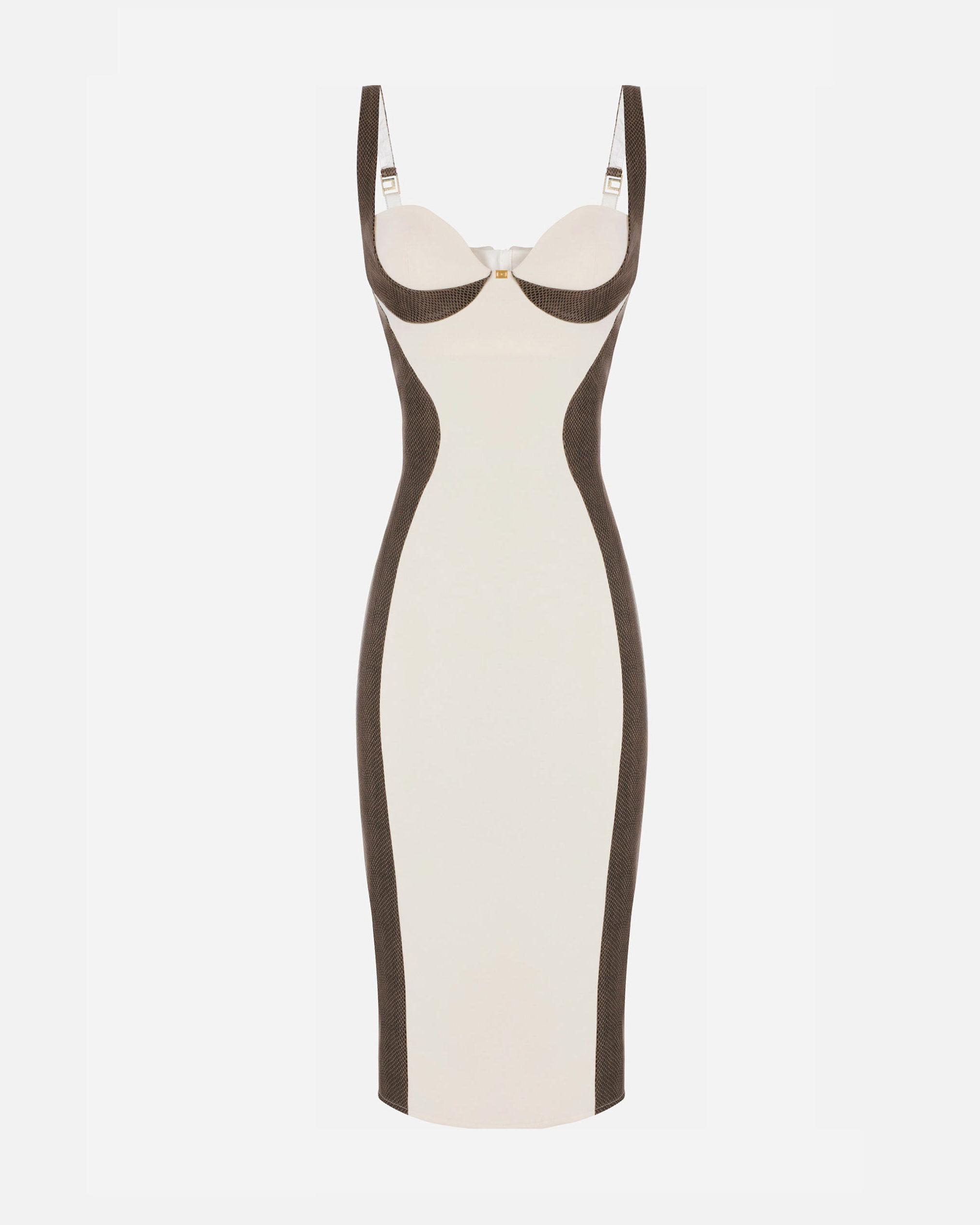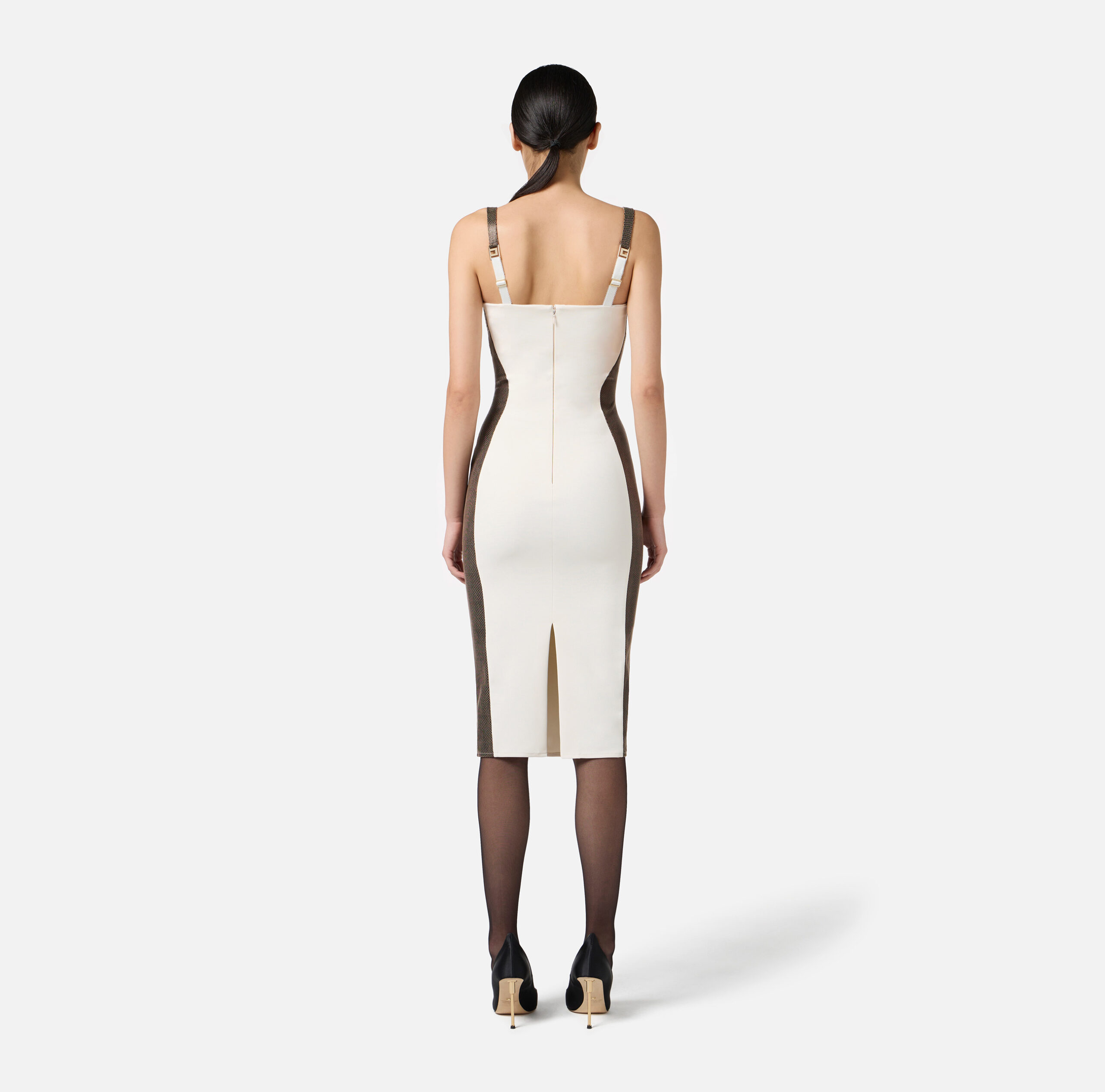 Vestido de crepé ligero de talla adherente. El vestido se caracteriza por la línea sinuosa adornada con aplicaciones de textura brillante con efecto pitón, colocadas a lo largo de copas y laterales para perfilar la figura. La falda presenta una pequeña abertura en la parte trasera. Un pequeño detalle con logotipo perfecciona la prenda.