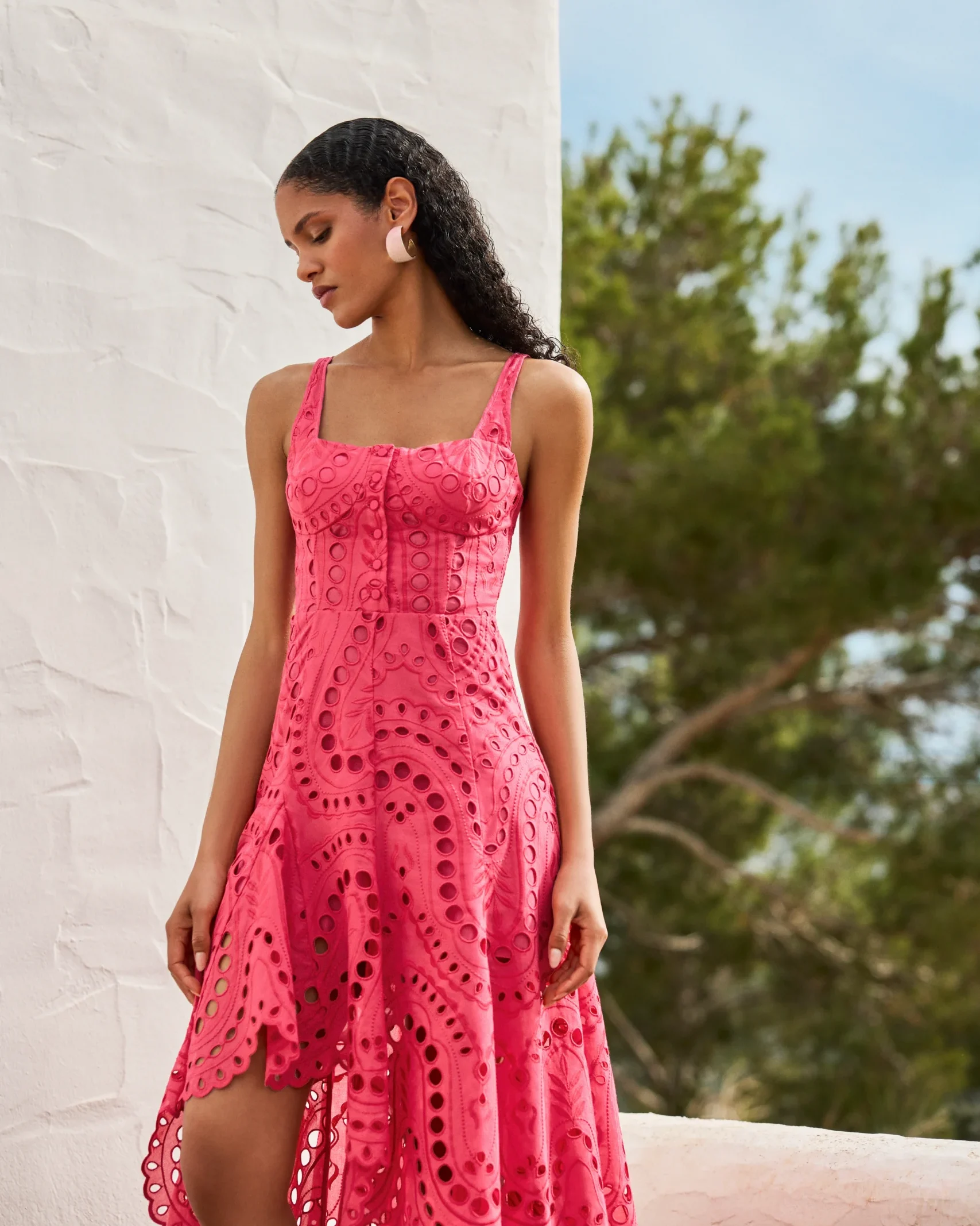 Nuestro vestido midi AYLA es una delicada pieza que combina la estructura de la corsetería con la ligereza del bordado artesanal. Su escote recto y tirantes finos realzan la parte superior del cuerpo, mientras una hilera de botones forrados recorre el busto aportando un sutil detalle clásico.