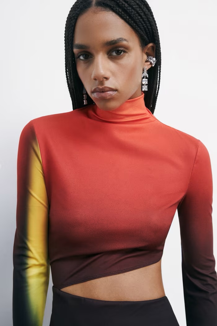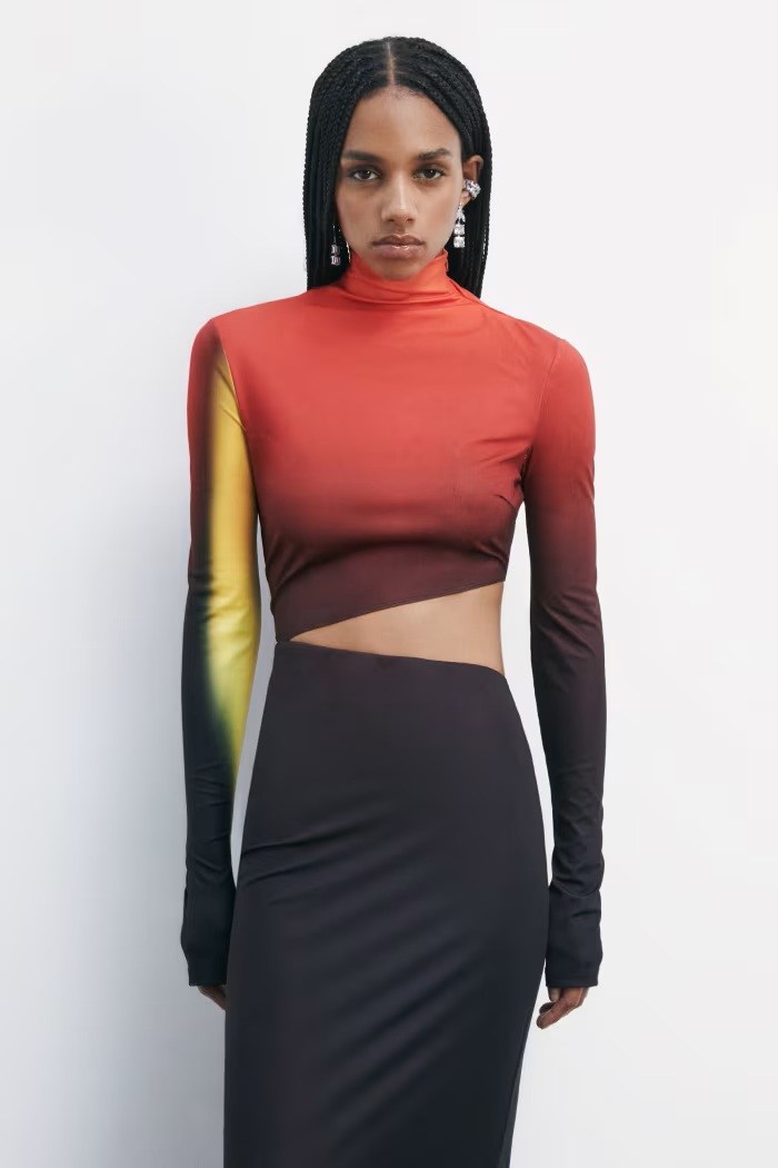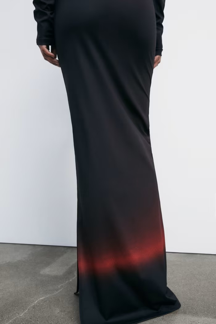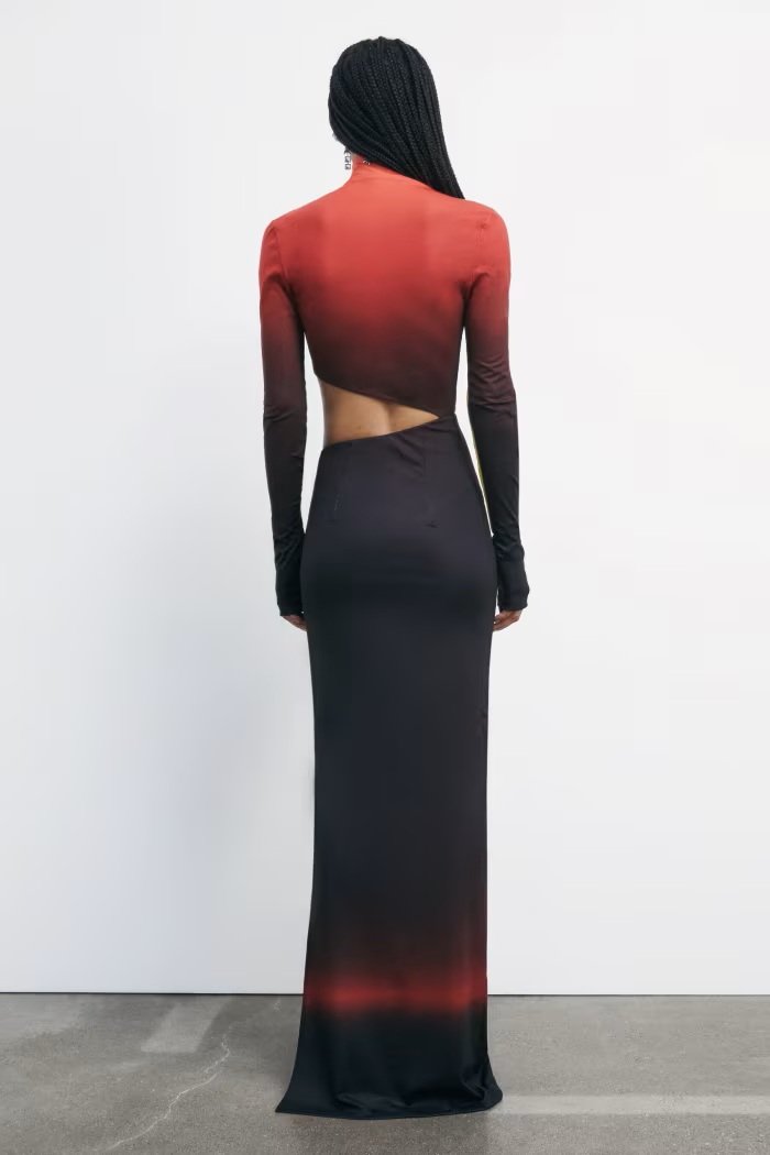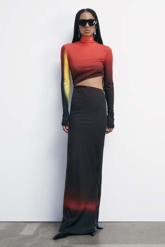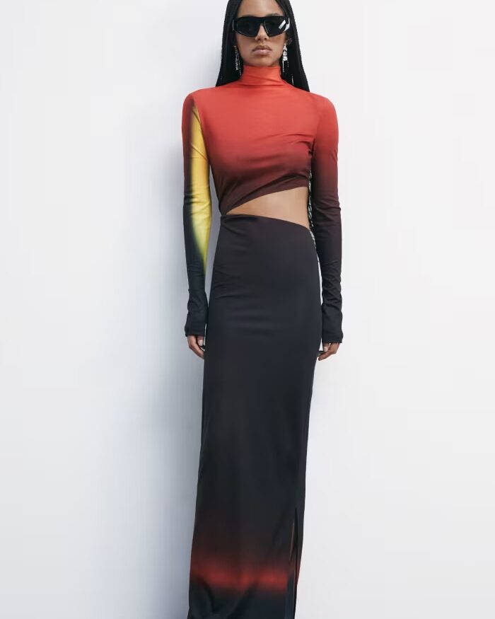 Una prenda clave de la temporada: este vestido largo de jersey técnico elástico realza una silueta audaz y sensual con abertura lateral. El cuello alto con detalle Fly en la espalda y el estampado degradado en tonos vibrantes aportan movimiento. Combínalo con tacones glossy y joyas de colección.