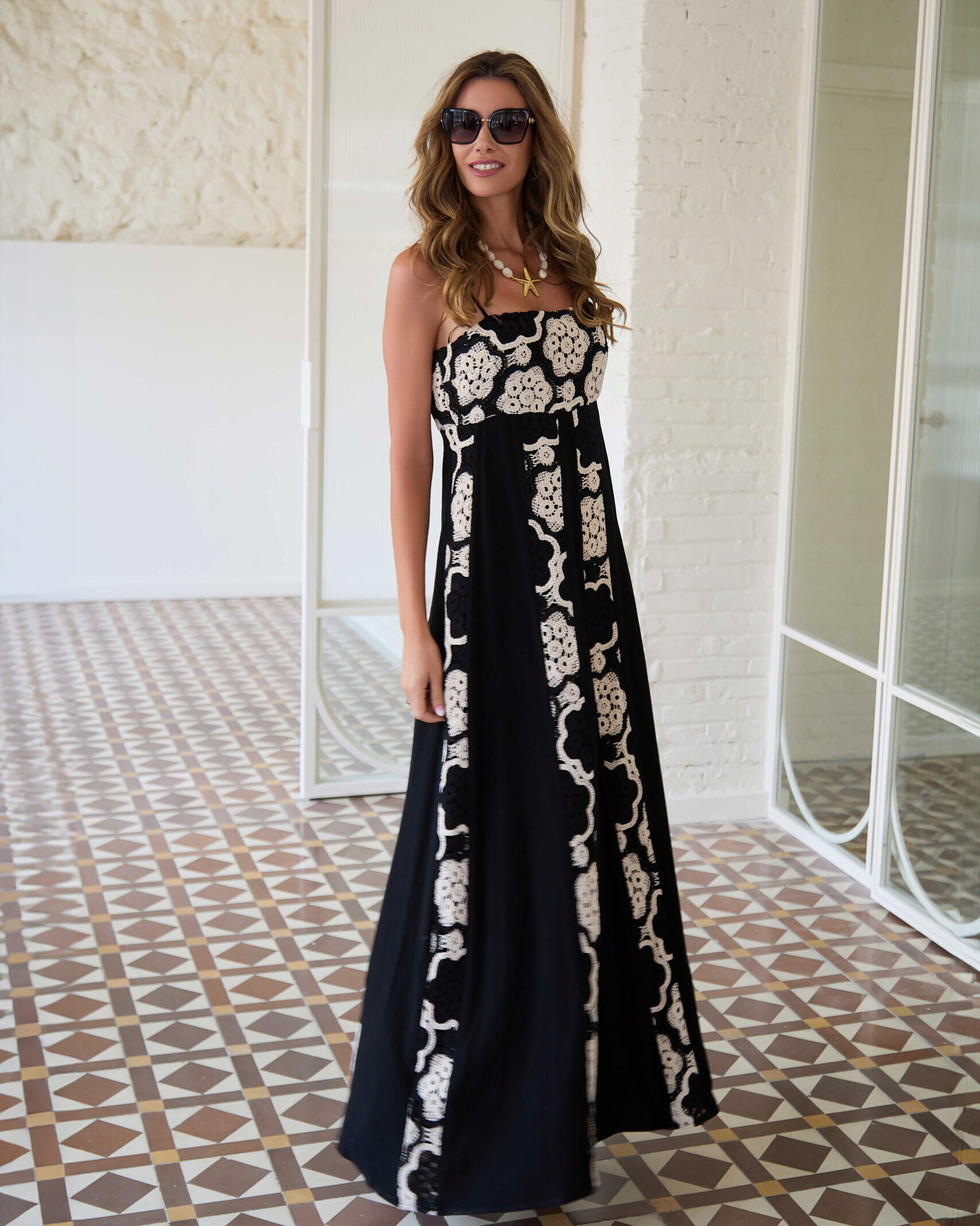 ¡El vestido maxi que combina elegancia y romanticismo en un solo look! En negro intenso con paneles de encaje blanco bordado en el corpiño y laterales, tirantes finos spaghetti, escote recto sutil y falda fluida con caída ligera y movimiento natural.