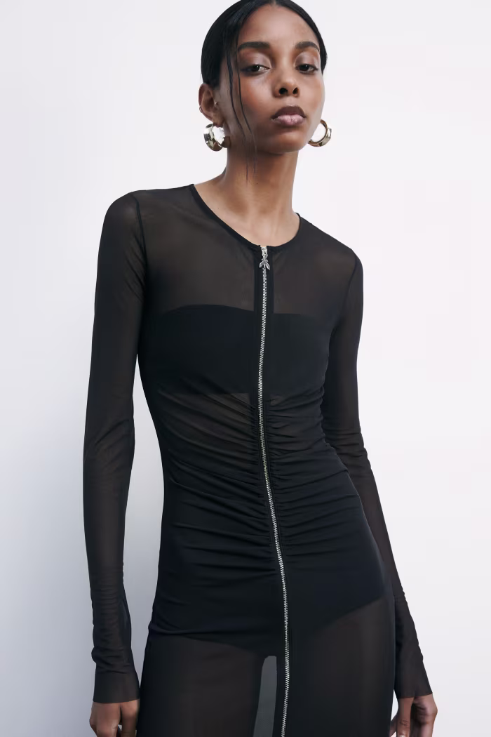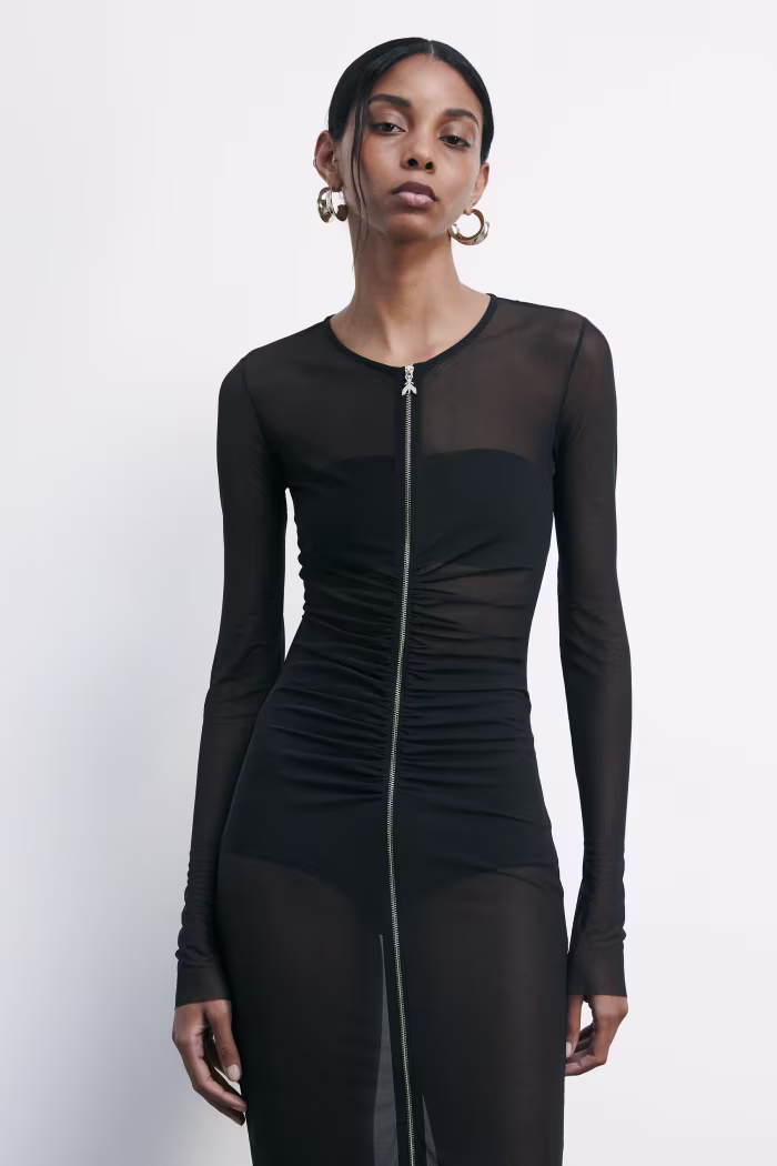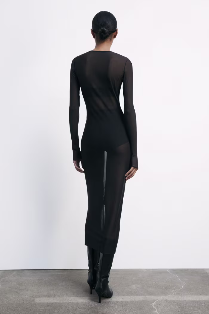 Vestido midi ajustado en tul negro elástico con efecto segunda piel. Su ligereza resalta la silueta con fluidez. La cremallera frontal completa le aporta un toque contemporáneo y múltiples opciones de estilo.