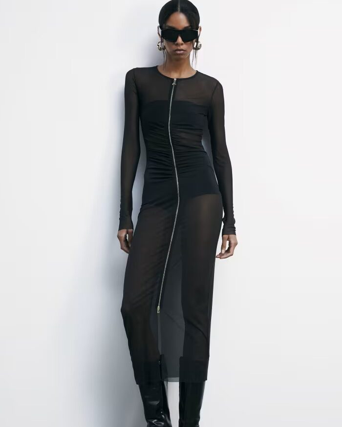 Vestido midi ajustado en tul negro elástico con efecto segunda piel. Su ligereza resalta la silueta con fluidez. La cremallera frontal completa le aporta un toque contemporáneo y múltiples opciones de estilo.
