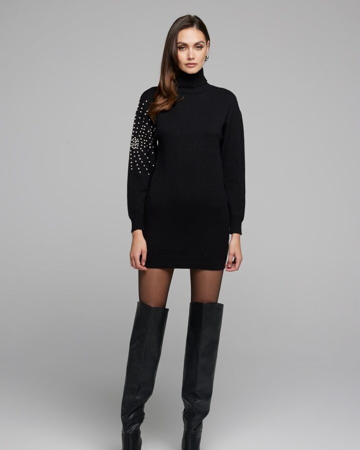 Descubre el vestido de punto negro que combina comodidad y estilo en un diseño atemporal. Este vestido de cuello alto está confeccionado en tejido de punto suave y elástico, ideal para climas frescos, con un corte recto que realza la figura. Destaca por sus detalles de perlas decorativas en la manga izquierda, añadiendo un toque de glamour y sofisticación a tu look diario o para eventos especiales.
