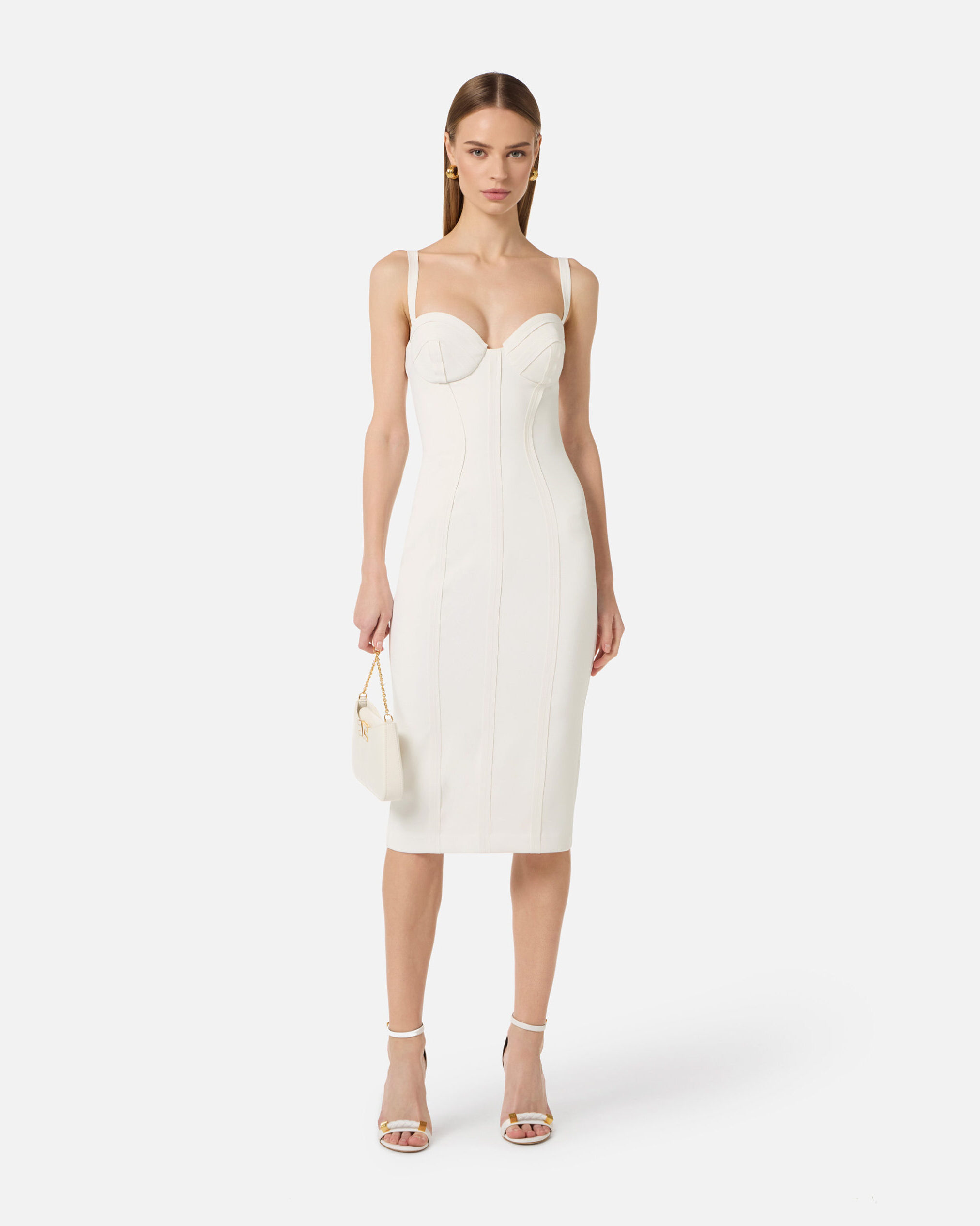 Vestido de crepé ligero de talla adherente. El vestido se distingue por las referencias al mundo de la corsetería, como el top inspirado en los clásicos corsé. La inspiración se repite en los cortes enfatizados por las costuras por fuera, acabadas con tela sin rematar y pespuntes.